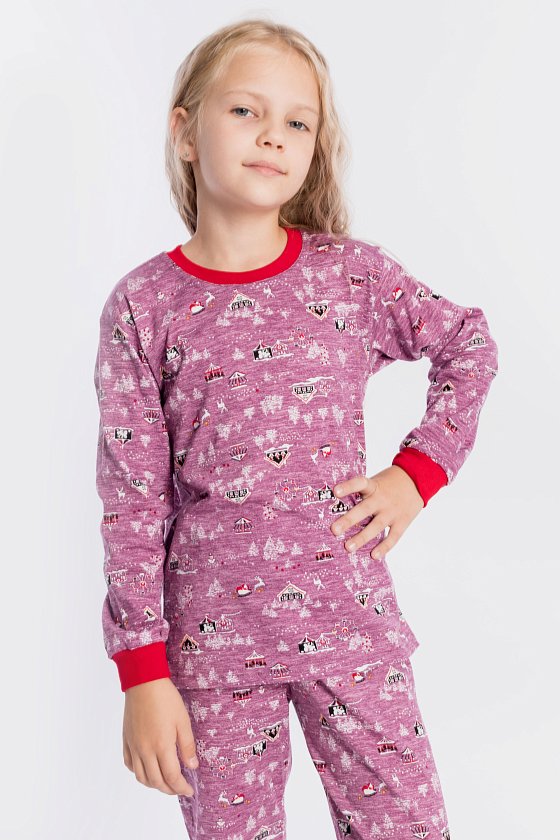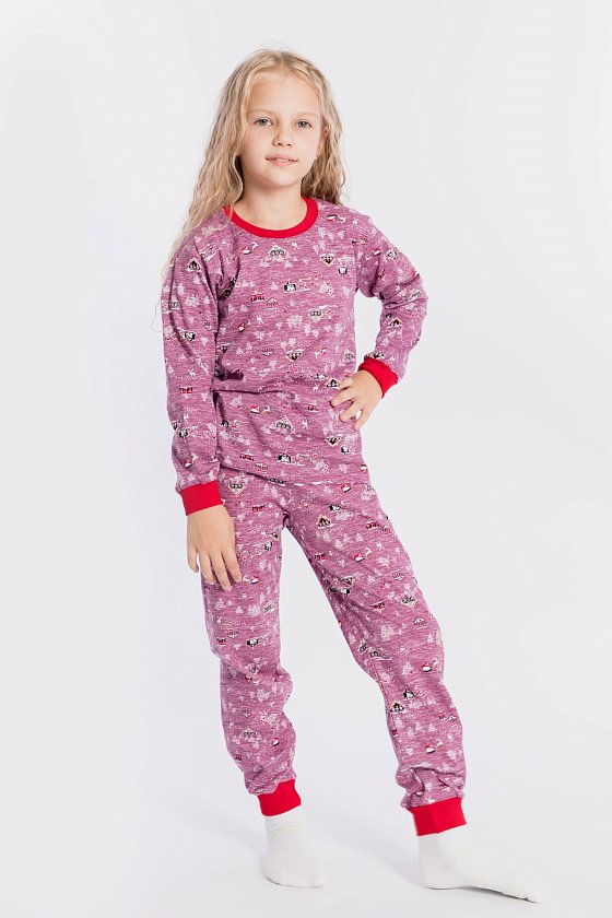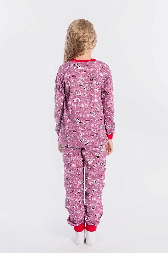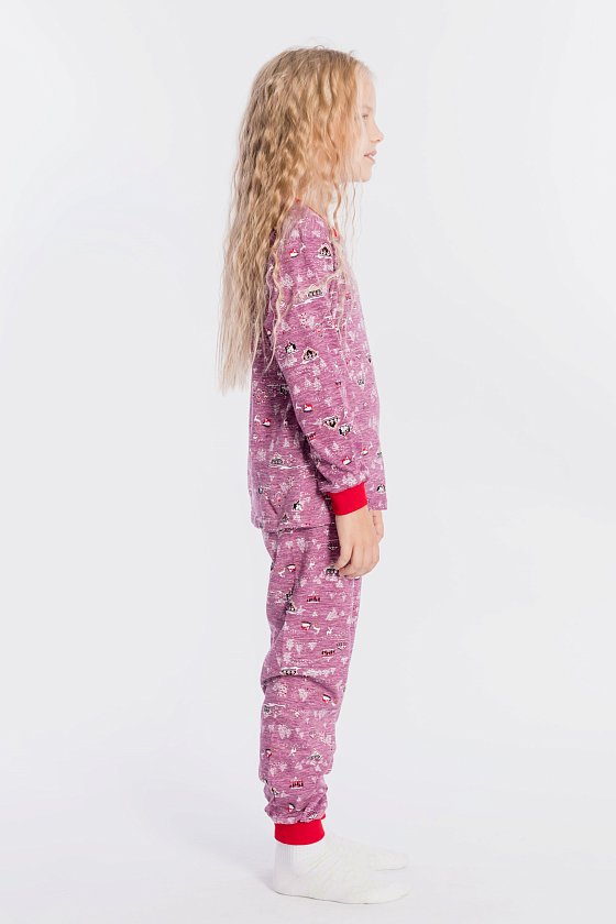 Пижама для девочки, выполнена из хлопковой ткани с набивным рисунком. Футболка с длинным рукавом на манжете, брюки с поясом на резинке и манжетах снизу.