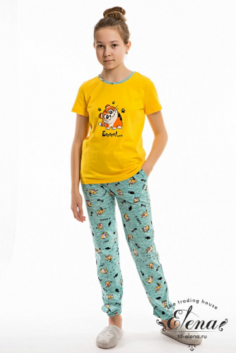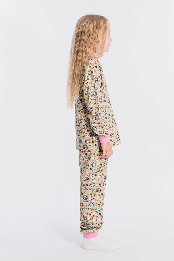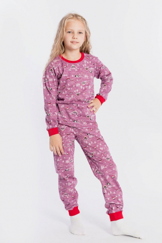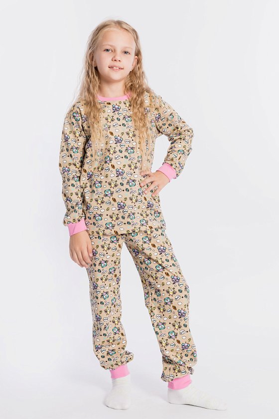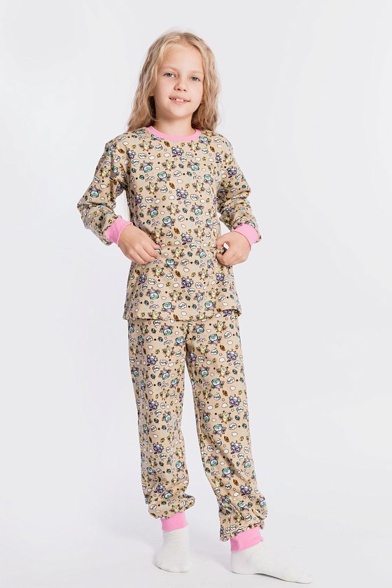 Пижама выполнена из хлопковой ткани с начёсом. Футболка с длинным рукавом и круглым вырезом горловины. Брюки прямого покроя на резине по поясу.