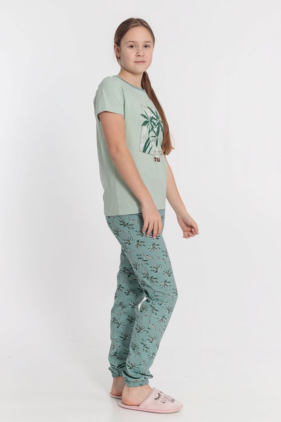 Костюм выполнен из х/б полотна, состоит из футболки и брюк. Футболка с принтом спереди, горловина обработана бейкой. Брюки с карманами по бокам, низ слегка присборен резинкой.