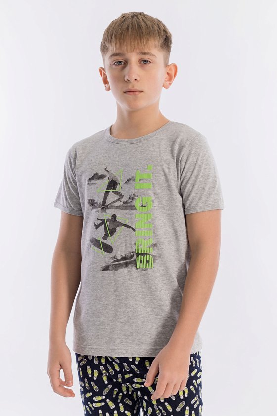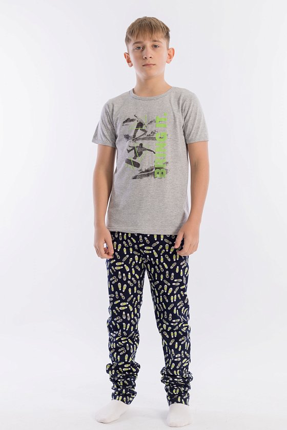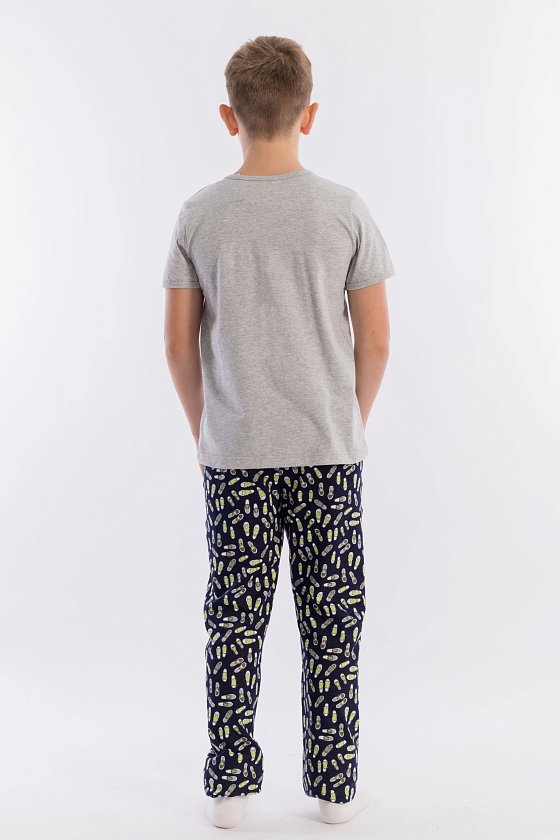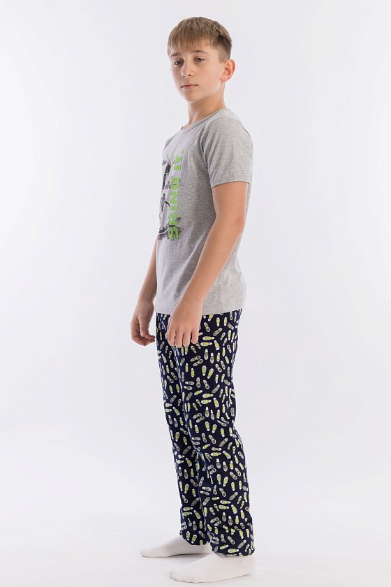Пижама выполнена из хлопкового полотна, состоит из брюк и футболки. Пояс брюк на резине. Футболка однотонная, с коротким рукавом и круглым вырезом горловины, оформленным бейкой. Спереди нанесён принт.