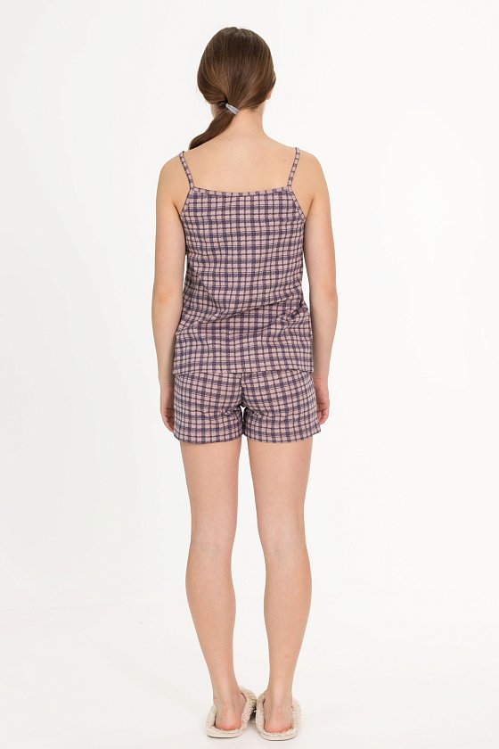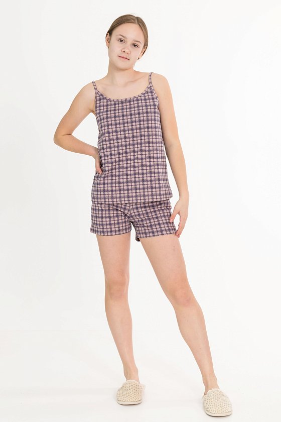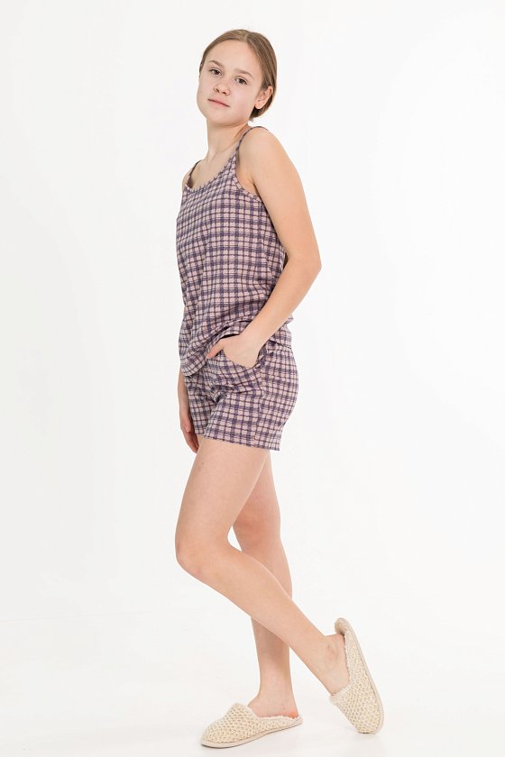 Майка на бретелях, шорты короткие с поясом на резинке и боковыми карманами.