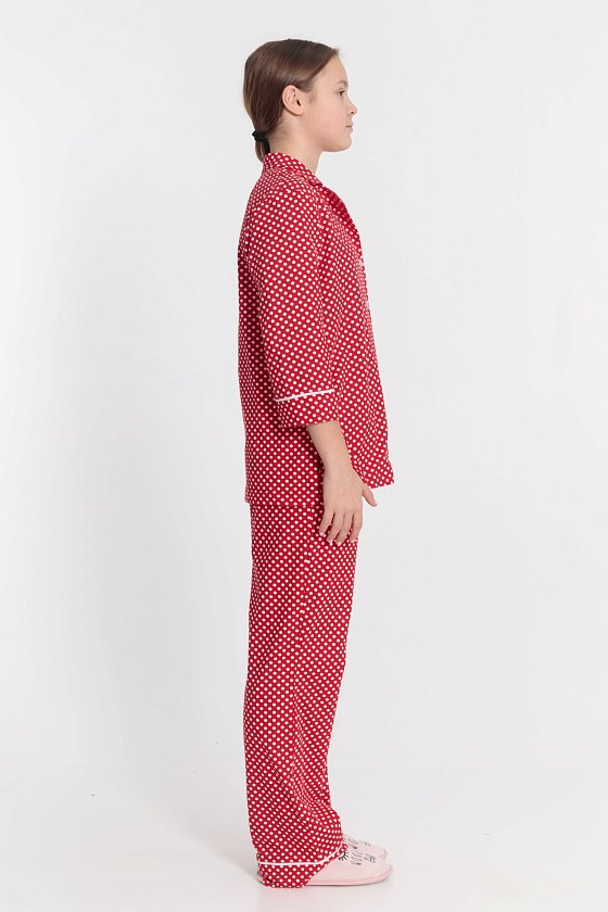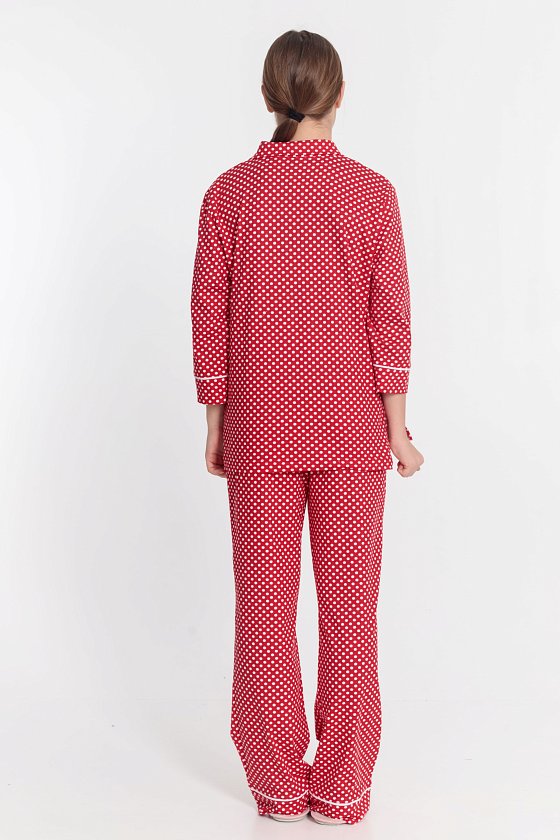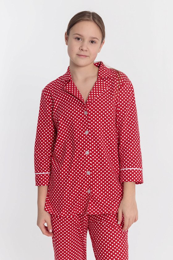 Пижама выполнена из кулирки с набивкой в горошек с отделкой кантом на рубашке и брюках. Рубашка с отложным воротником и бортами, с рукавом длиной 3/4 и разрезами в боковых швах. Спереди застёжка на пуговицы. Брюки с боковыми карманами и притачным поясом.