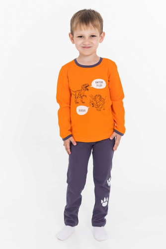 Низ рукавов и горловина футболки обработаны бейкой в цвет брюк, что придаёт изделию аккуратный вид. На футболке и брюках имеется принт, который понравится вашему ребенку.