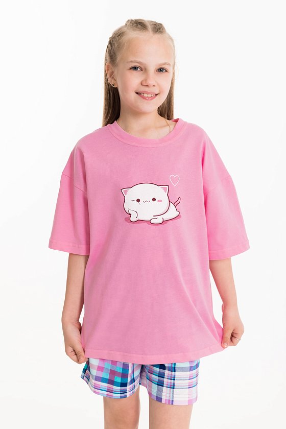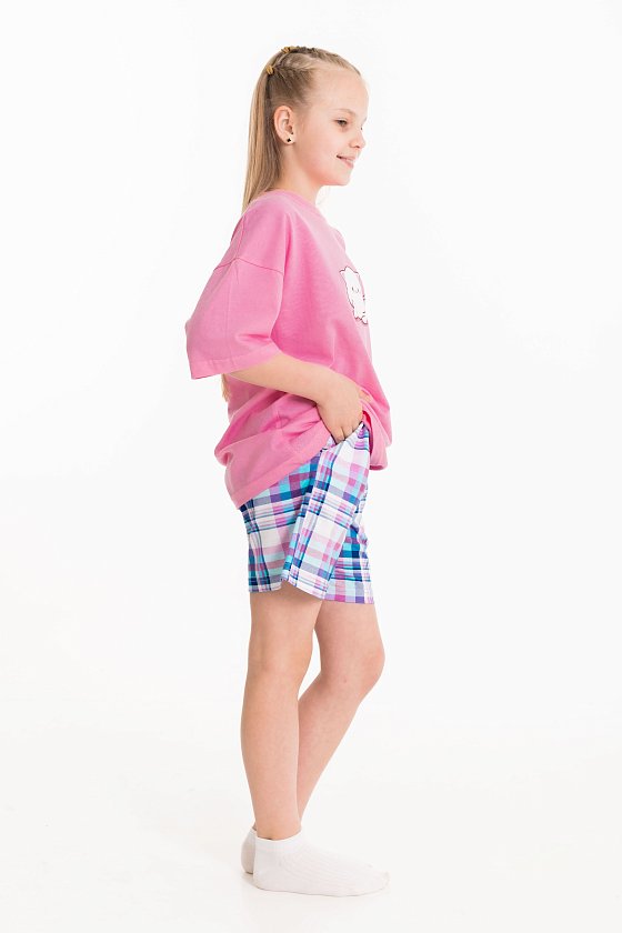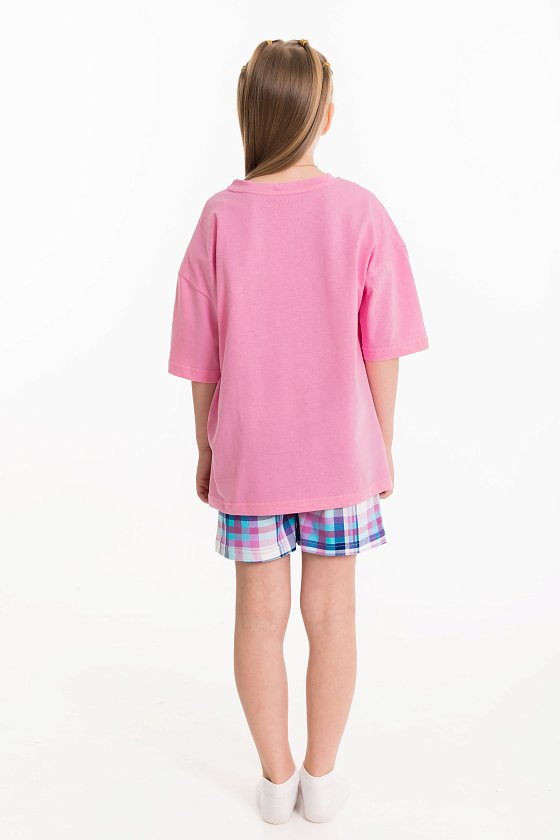 Пижама для девочек состоит из свободных шорт и футболки, выполненных из мягкой и приятной на ощупь ткани — кулирки (100% хлопок). Футболка свободного кроя с круглым вырезом горловины и рукавом до локтя. Особенностью модели является спущенная линия плеча и интересный принт спереди. Шорты также выполнены из кулирки с набивным рисунком, они удлинённые, свободного кроя и имеют боковые карманы. Пояс на широкой резинке обеспечивает комфортную посадку. Изготовленная из натуральной ткани, пижама обеспечит комфорт в течение всего дня.