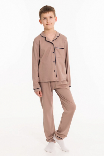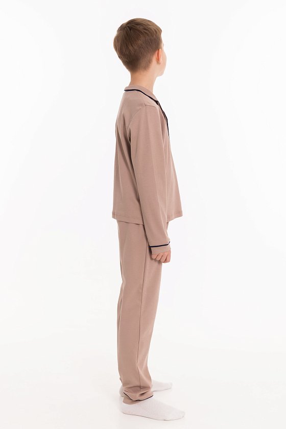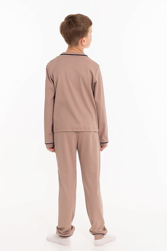 Детская пижама выполнена из интерлока, 100% хлопок. Рубашка с отложным воротником, длинным рукавом и карманом спереди. Рубашка застёгивается на пуговицы. Брюки свободные, с притачным поясом на резине. Рубашка и брюки украшены декоративным элементом - кантом.