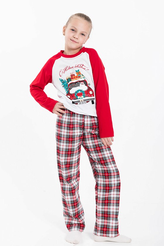 Детская пижама новогодняя - лонгслив и брюки, изготовлена из мягкого и приятного к телу хлопкового полотна. Лонгслив прямого кроя, рукава реглан, перед и спинка белого цвета, спереди нанесён принт. Круглый вырез горловины отделан бейкой красного цвета. Брюки прямого кроя из кулирки с набивным рисунком в клетку, пояс на резинке. Изготовленная из натуральной ткани, пижама обеспечит комфорт в течение всего дня.