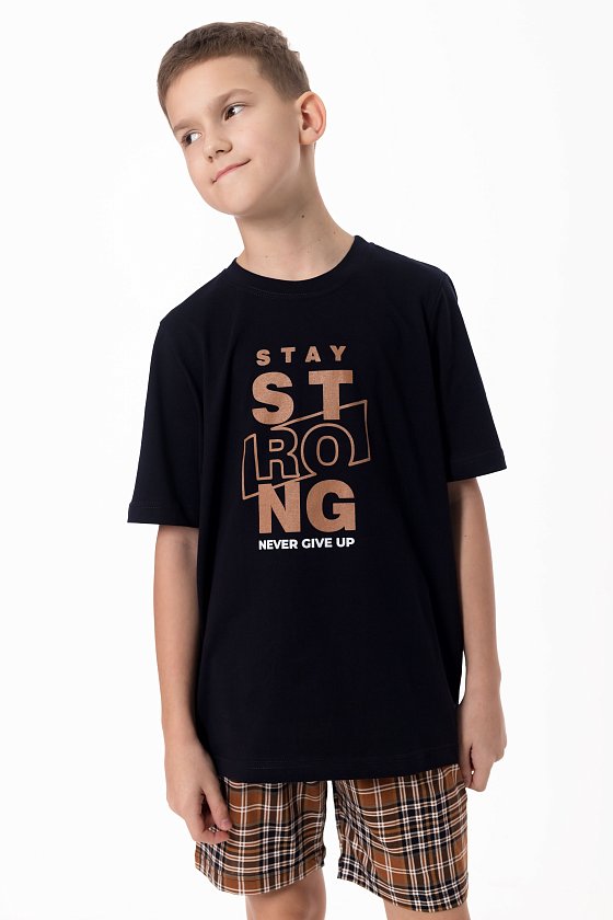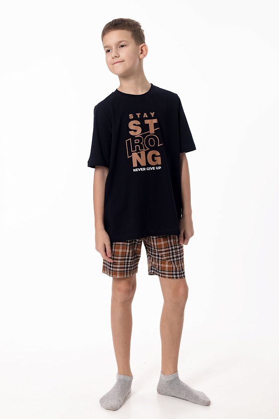 Пижама выполнена из натурального хлопкового полотна, обеспечивающего комфорт и приятные ощущения во время сна и отдыха. Комплект состоит из удобных шорт в клетку без карманов с эластичным поясом и однотонной футболки с коротким рукавом. Круглый вырез горловины аккуратно оформлен бейкой, а спереди расположен принт, придающий модели аккуратный и уютный акцент. Пижама отлично подойдёт для комфортного домашнего отдыха и спокойного сна.