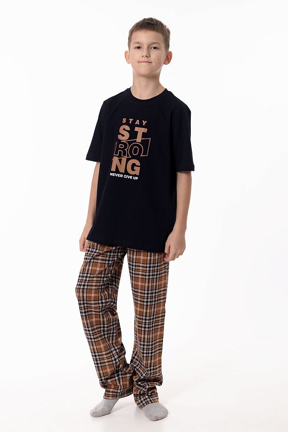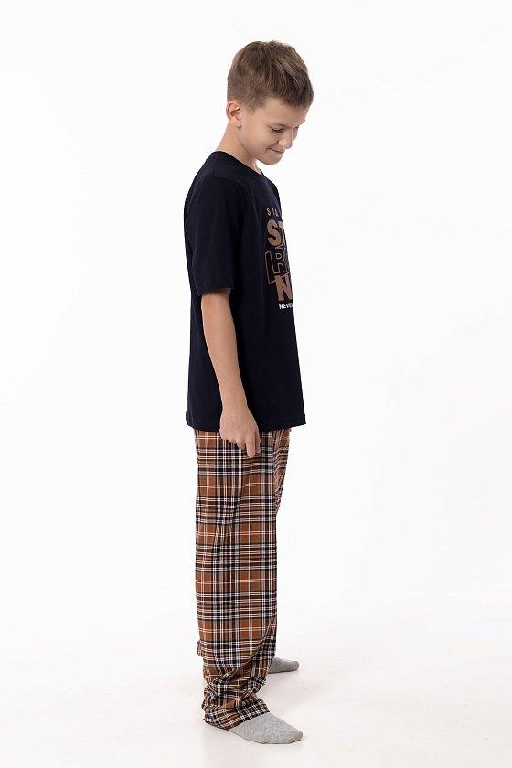 Пижама выполнена из натурального хлопкового полотна, обеспечивающего комфорт и приятные ощущения во время сна и отдыха. Комплект состоит из удобных брюк в клетку с эластичным поясом и однотонной футболки с коротким рукавом. Круглый вырез горловины аккуратно оформлен бейкой, а спереди расположен принт, придающий модели аккуратный и уютный акцент. Пижама отлично подойдёт для комфортного домашнего отдыха и спокойного сна.