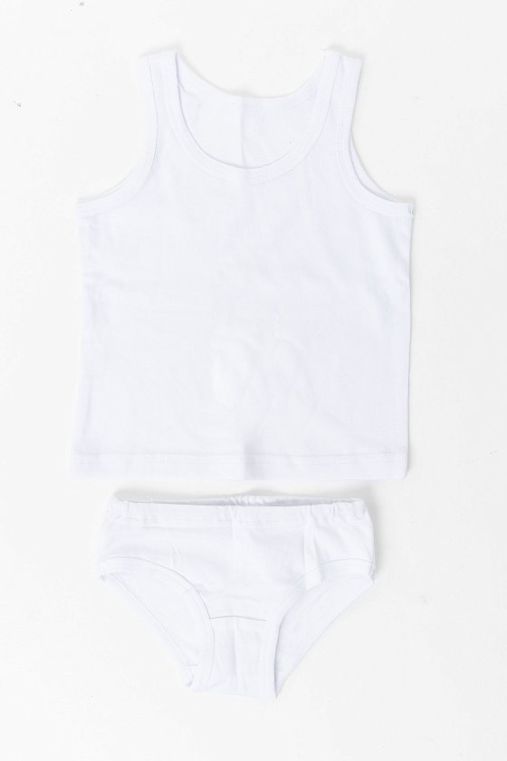 Комплект нижнего белья для девочки выполнен из кулирки, 100% хлопок. Майка с широкими бретелями имеет свободный комфортный крой. Плавки с высокой посадкой и резиной по талии. По горловине, проймам и «ножкам» комплекта обработка бейкой.