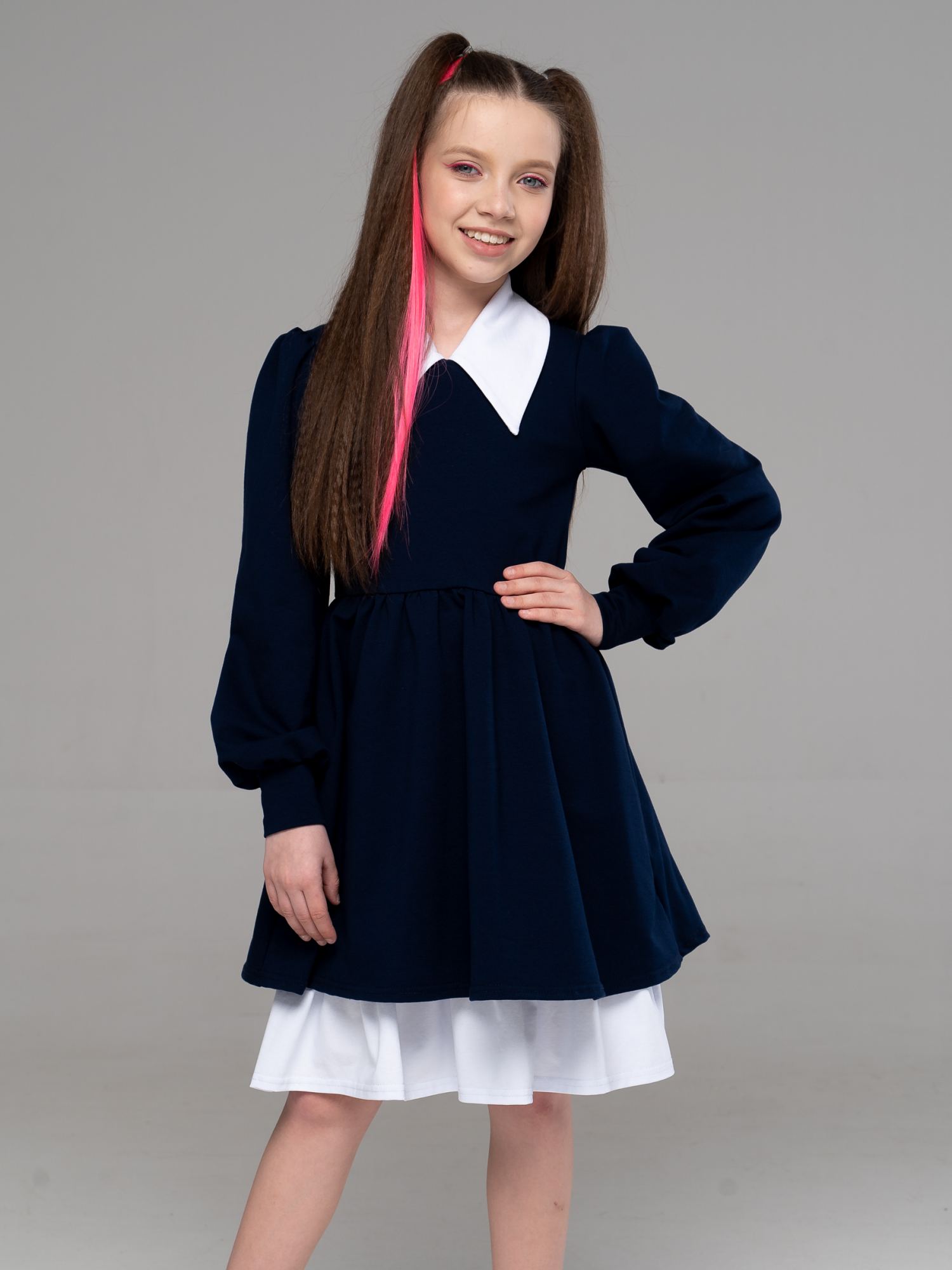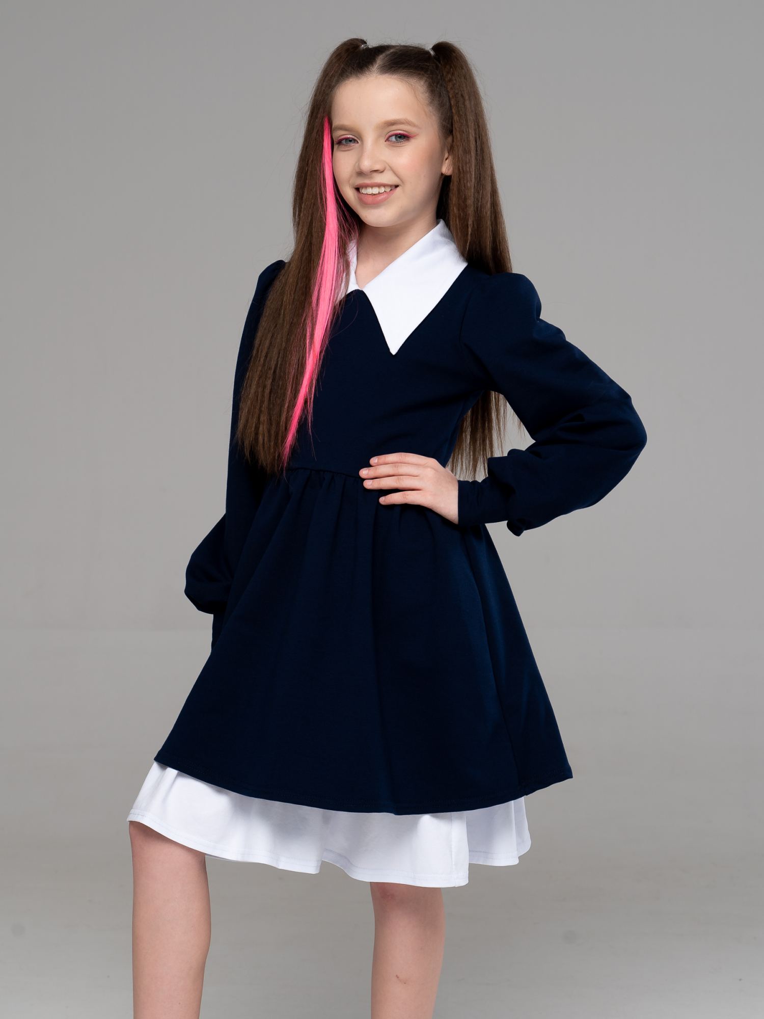 Модное платье 3 в 1 из школьной коллекции looklie для девочки с фигурным белым воротником. Модель состоит из двух платьев. Верхнее платье выполнено из премиального футера из футера темно-синего цвета для девочки, который приятен на ощупь и хорошо держит форму.Легкое и воздушное платье полуприлегающего силуэта , отрезное по линии талии, подчеркивает фигуру девочки . Длинные рукава со сборками по окату и низу и высокими манжетами придают дополнительный объем и делают его идеальным выбором для прохладных дней.