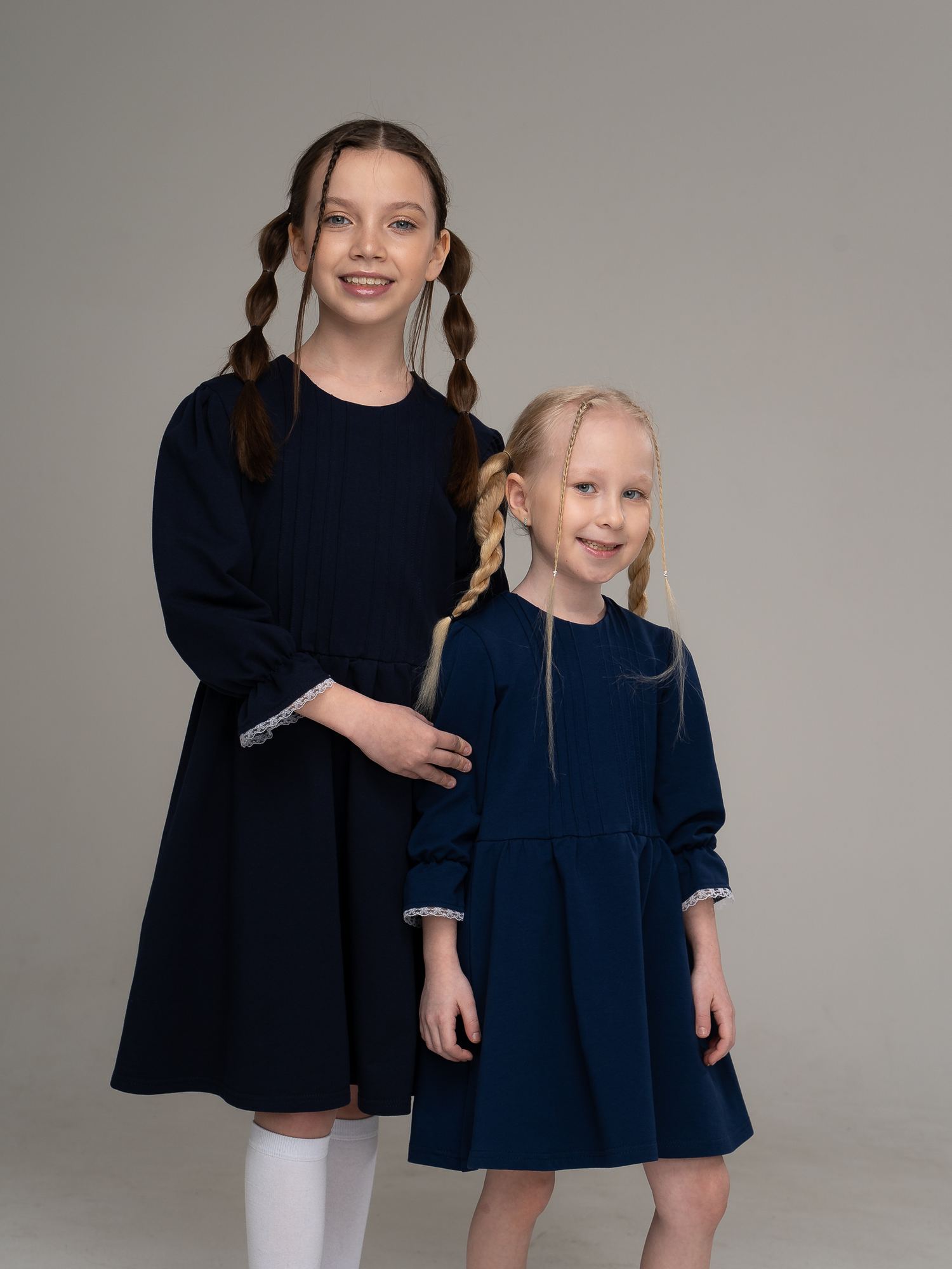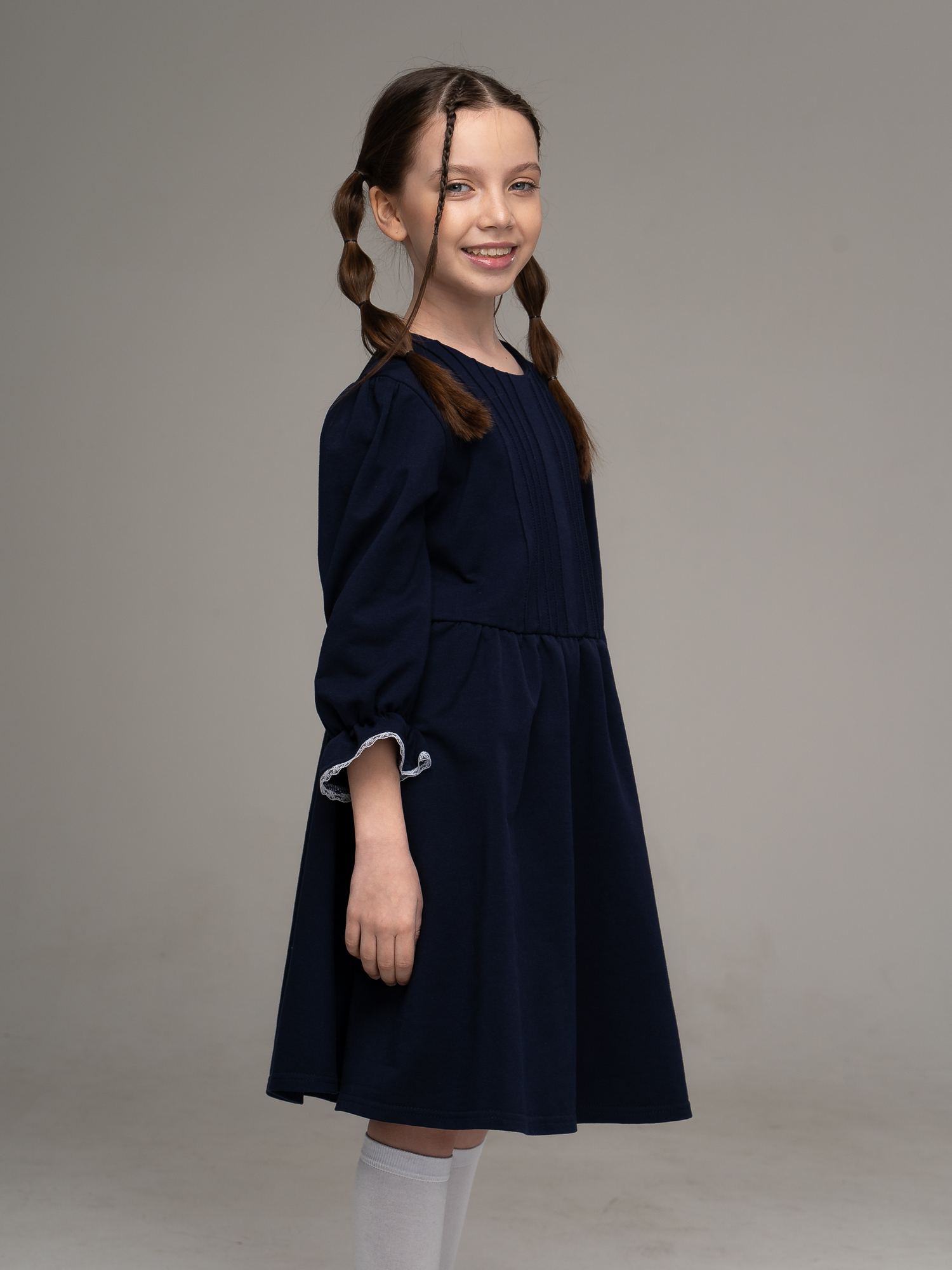 Школьное платье из футера темно-синего цвета для девочкибез воротника, отрезное по линии талии. Спереди на лифе - отделка в виде нескольких застроченных складок, юбка со сборкой по линии талии. Сзади по спинке - потайная застежка-молния. Рукава длиной 3/4 присборены с помощью резинки, по низу рукава настрочено кружево. Дополнительно для украшения платья можно использовать съемный воротник. Изделие выполнено из трикотажа премиального качества - ПЕНЬЕ, с содержанием хлопка более 92%