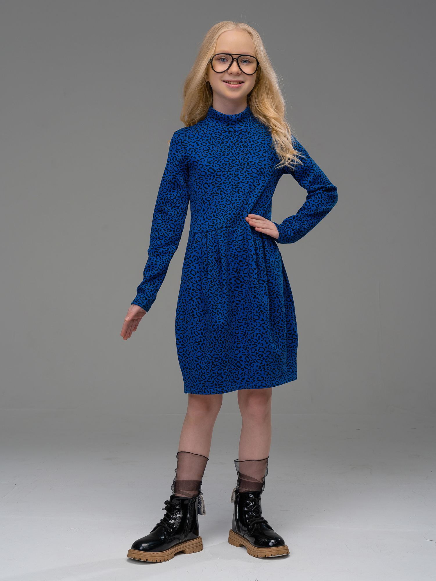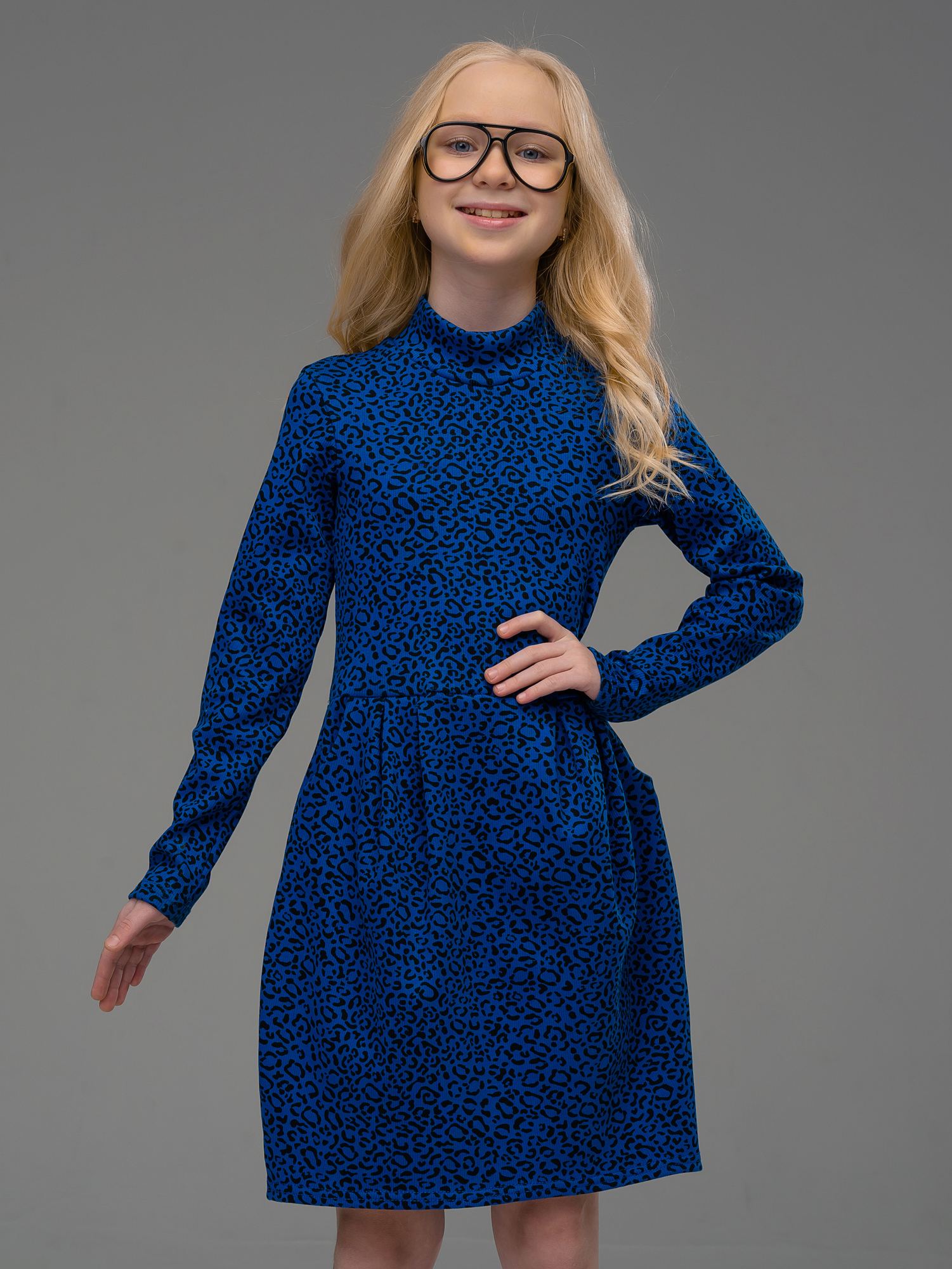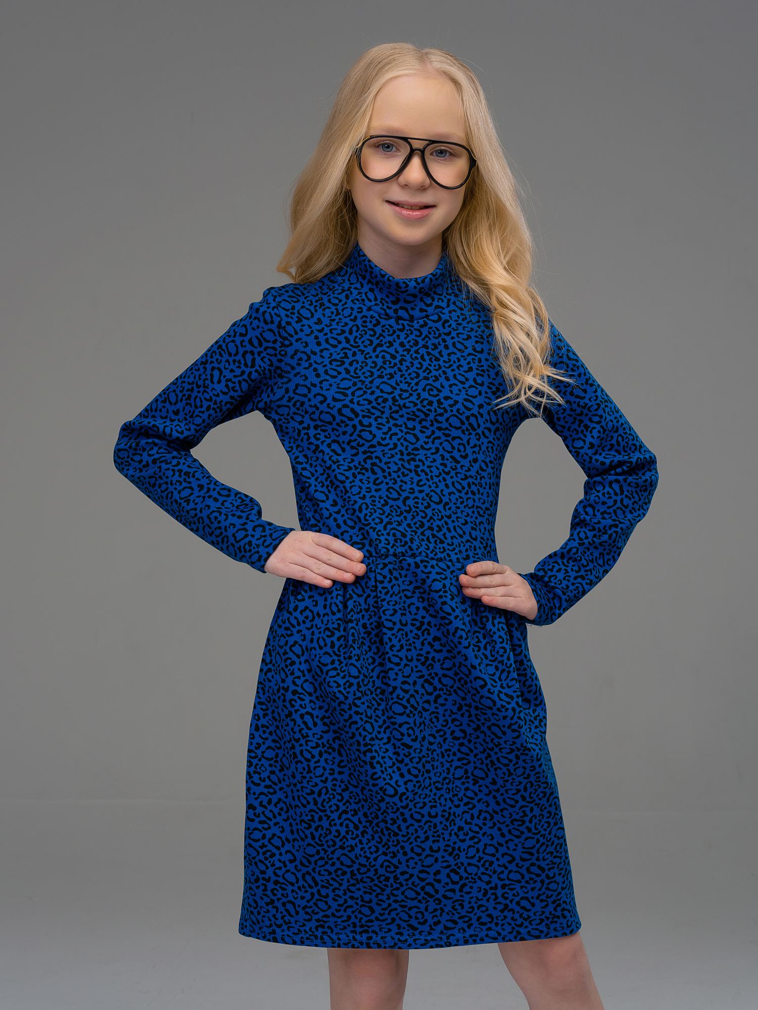 Платье-"тюльпан" из кашкорсе василькового цвета для девочки. Платье с длинным рукавом и высоким горлом, юбка с боковыми карманами и оригинальными складками.