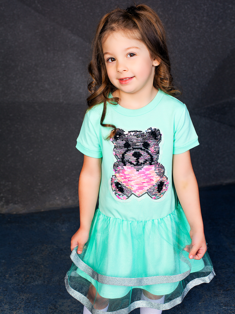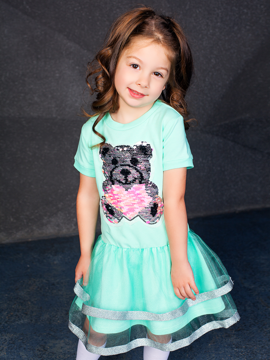 Платье выполнено из трикотажного полотна.Украшением служит аппликация с двойными пайетками.Рисунок меняется