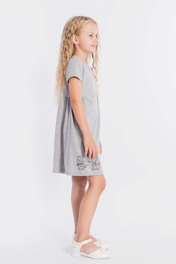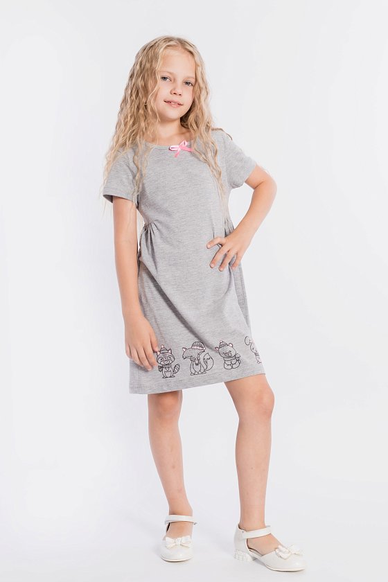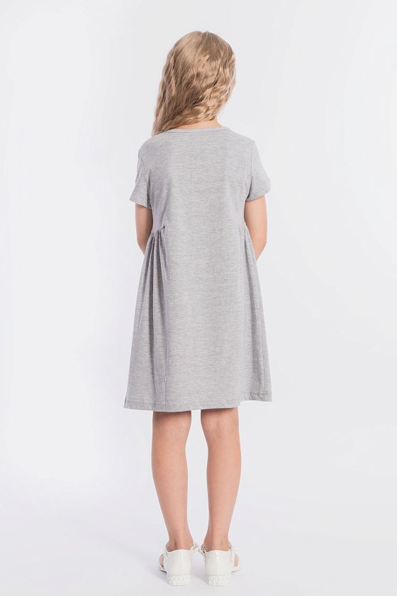Платье выполнено из меланжевой кулирки, 100% хлопок. С коротким втачным рукавом, с подрезами на полочке и спинке, нижняя часть подрезов со сборкой. Спереди нанесён принт. На горловине расположен декоративный бантик.
