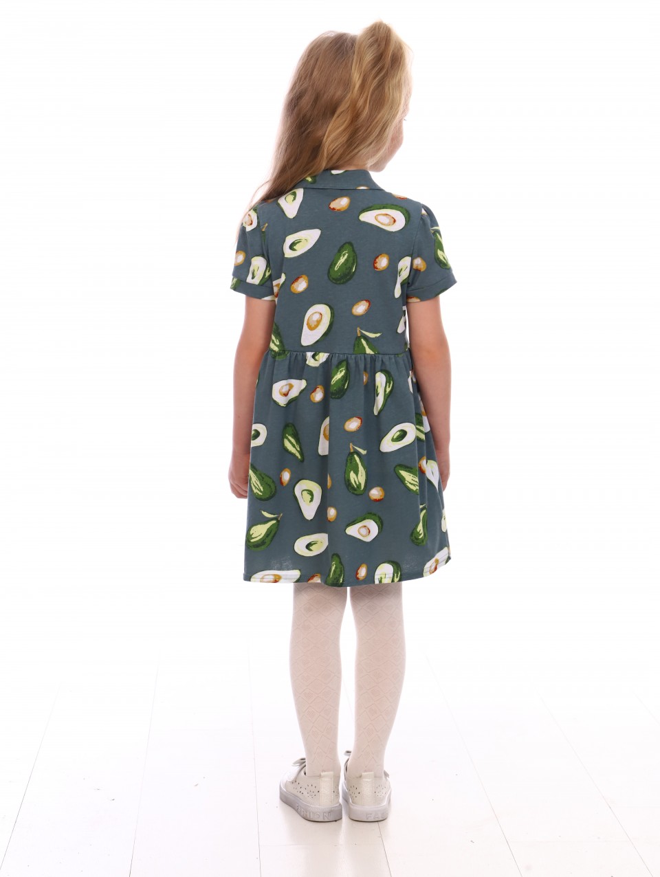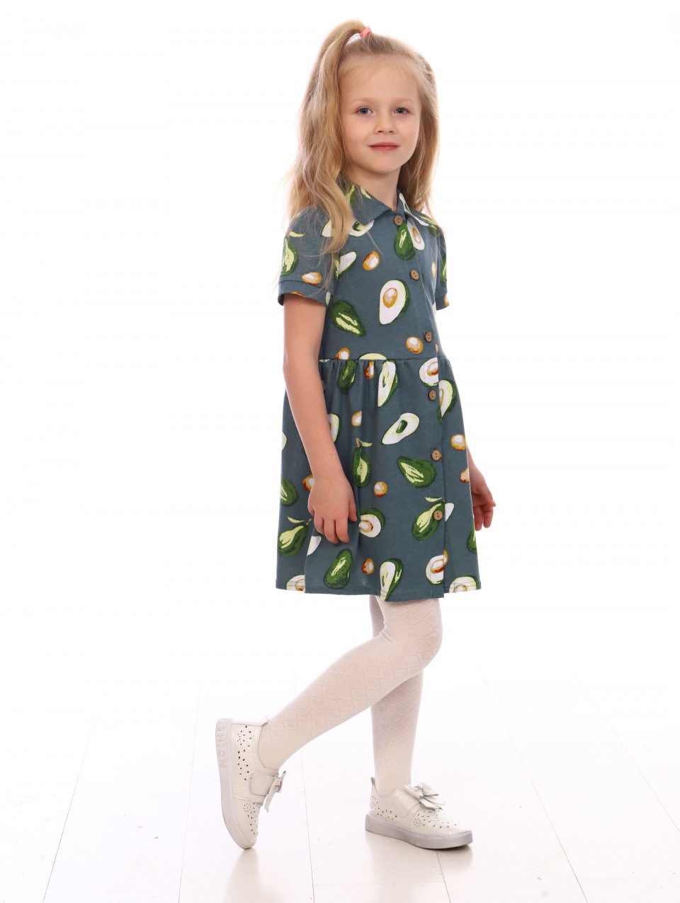 Платье-рубашка с отрезным швом на талии и короткими рукавами. Застегивается на пуговицы.