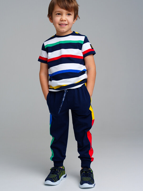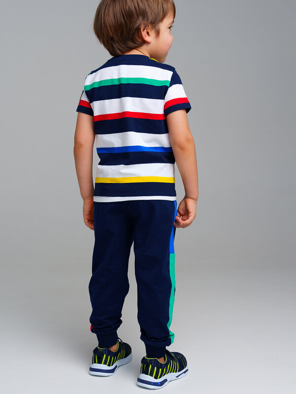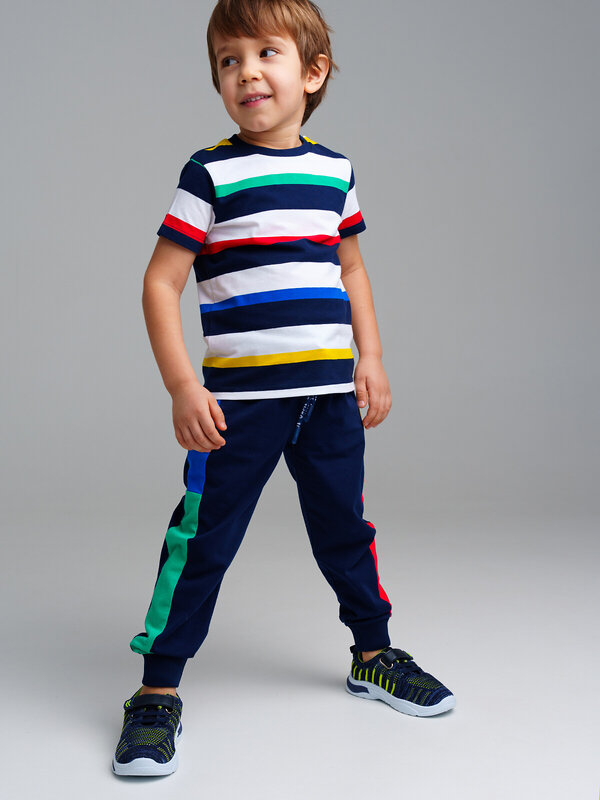 Комплект: футболка, брюки. Посадка regular fit. Из качественного эластичного и приятного на ощупь трикотажа джерси. Высокое содержание хлопка 95%. Благодаря наличию эластана в составе ткани изделие держит форму и меньше мнется. Принт сохраняет первоначальный вид даже после многочисленных стирок. Эластичный пояс с тесьмой позволяет легко надевать и утягивать до идеальной посадки в зависимости от комплекции ребенка. Нижняя кромка брючин в эластичный рубчик.
