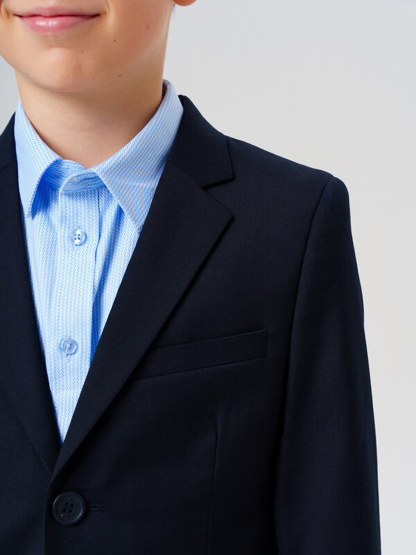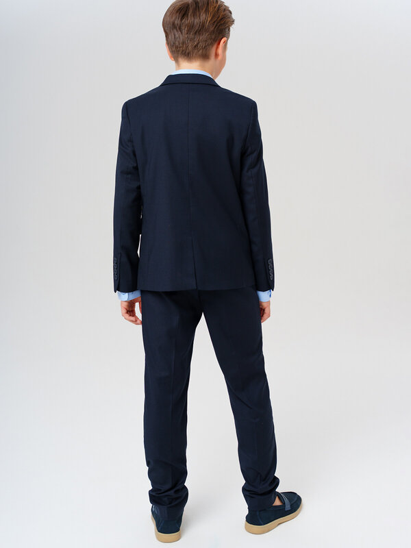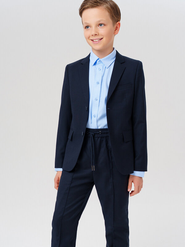 Этот элегантный костюм в темно-синем цвете отлично подойдет для школьника и станет универсальным вариантом в школу или для повседневной носки.