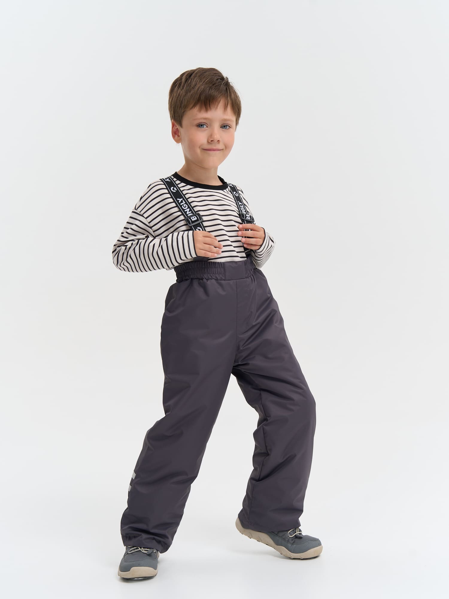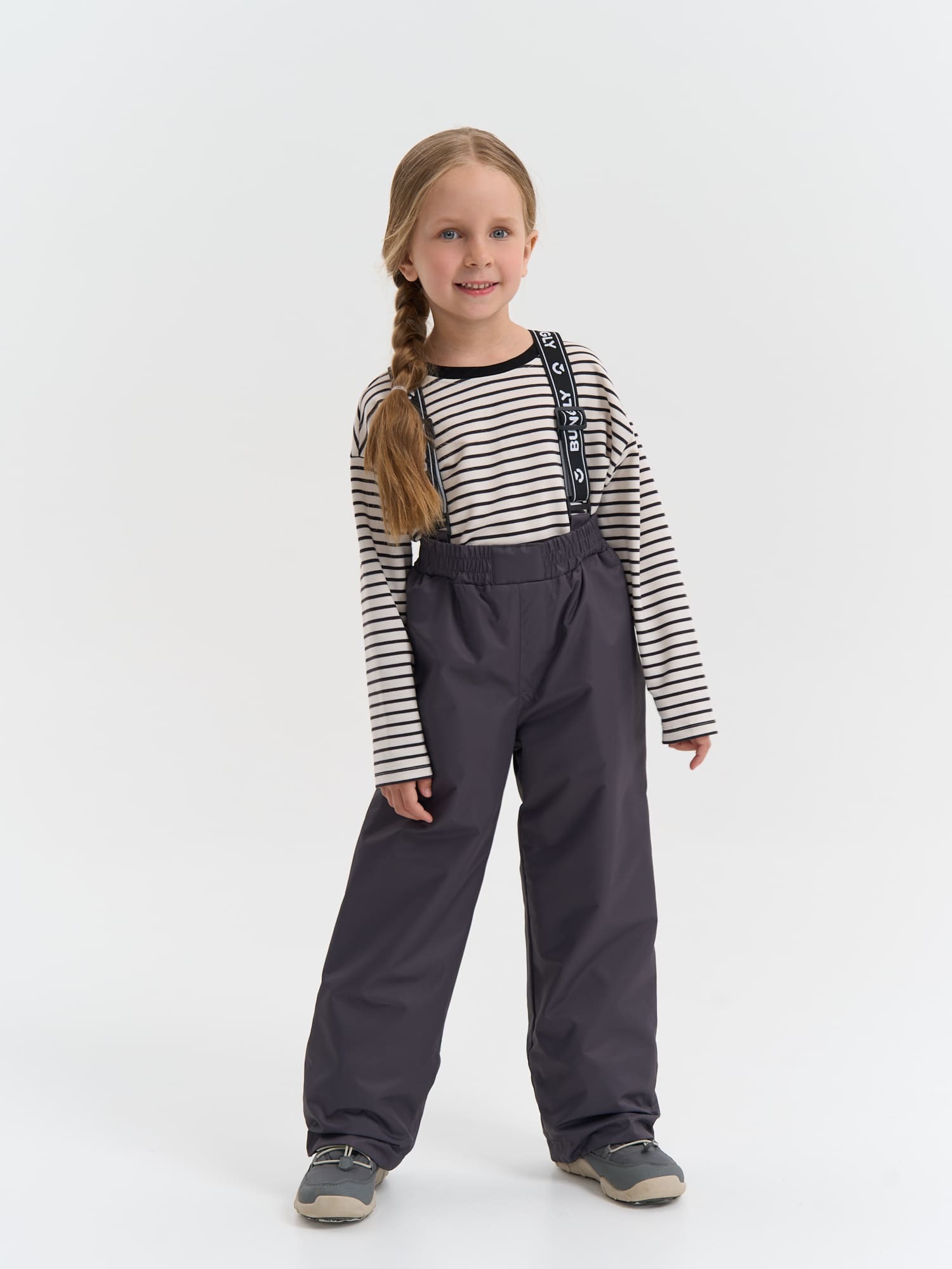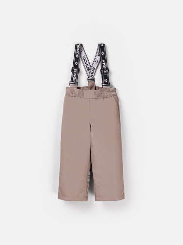Пояс на мягкой резинке легко подстраивается под фигуру, а съемные регулируемые бретели крепятся на удобные паты – брюки не сползают даже при катании с горки или других активных играх.