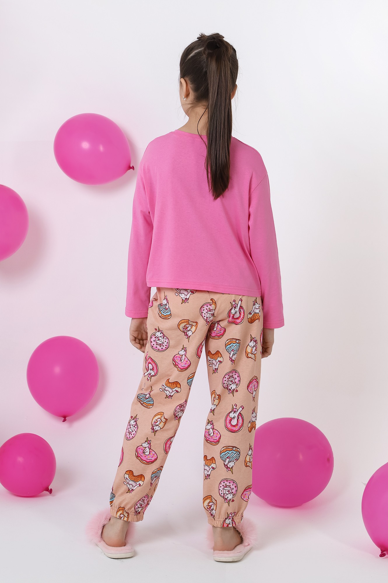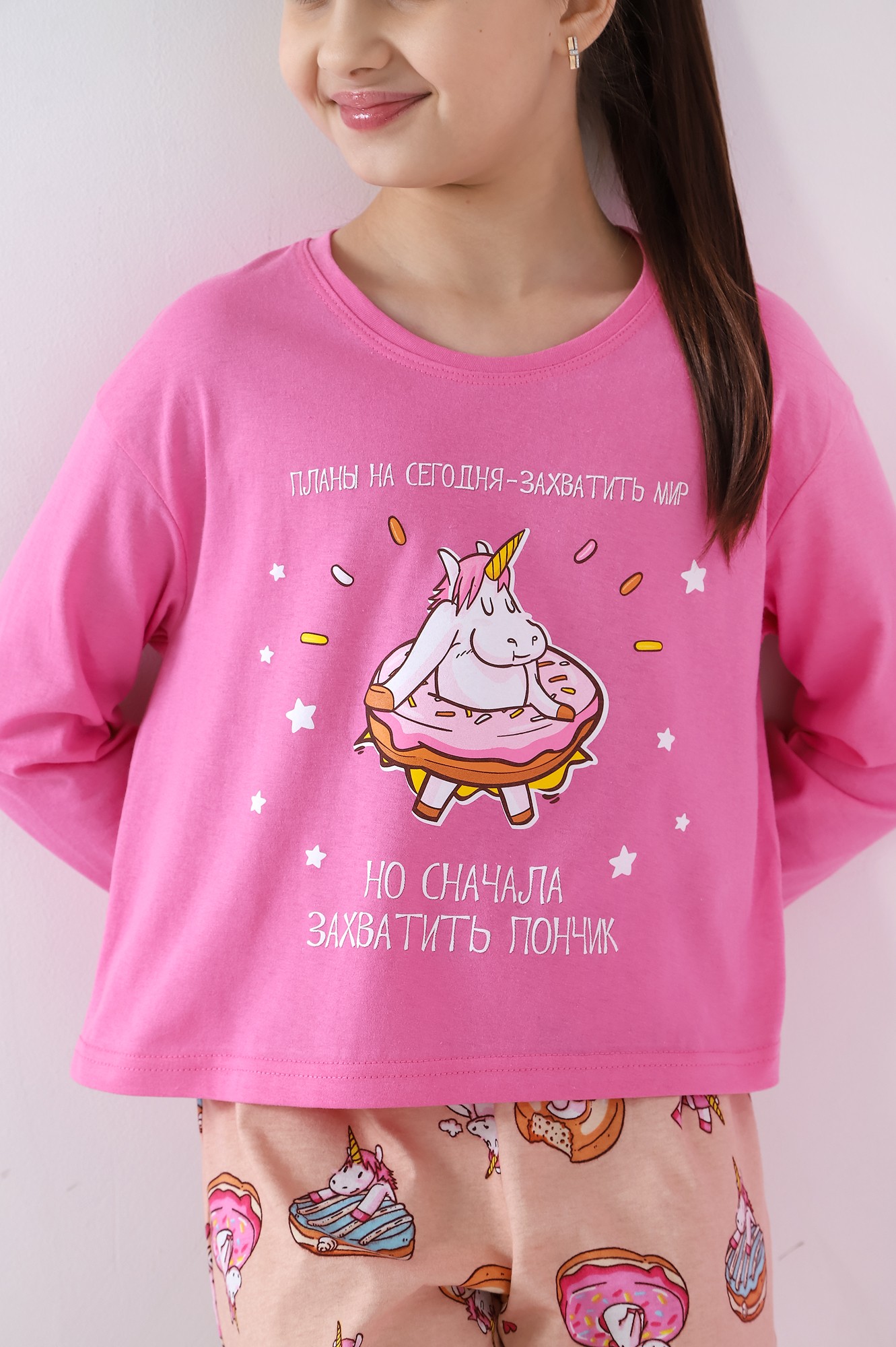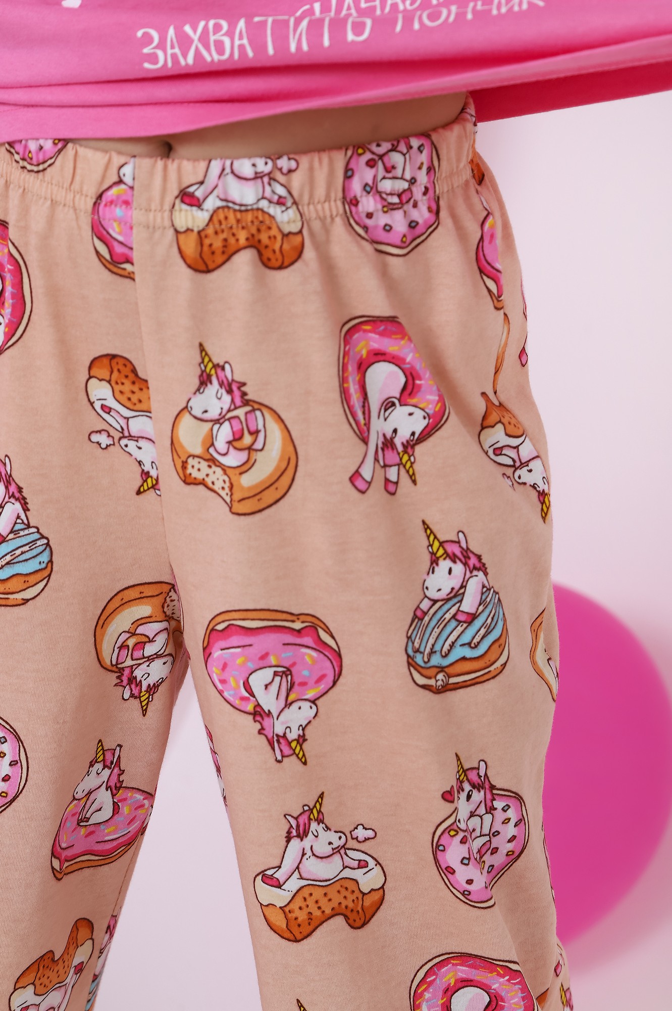 Пижама для девочки из трикотажного полотна "кулирка", состоящая из джемпера и брюк. Джемпер - из гладкокрашеного полотна, слега расширенный и укороченный, с втачными длинными рукавами, горловиной овальной формы, обработанной втачной планкой и принтом в центре переда, выполненным в технике шелкографии. Брюки из полотна с набивным тематическим рисунком, длинные, с эластичной тесьмой по талии и нижним срезами.