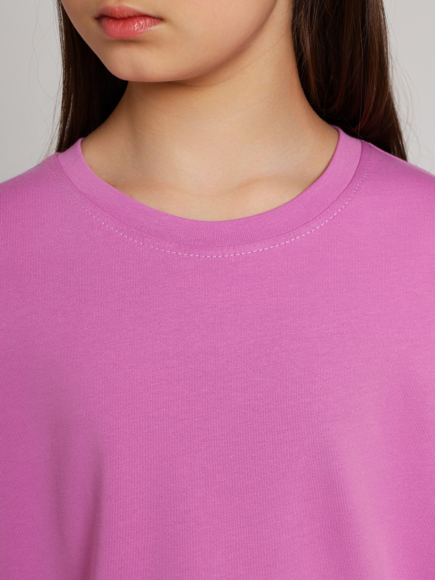 Костюм для девочки из плотного гладкокрашеного трикотажного полотна "кулирка", состоящий из футболки и шорт. Футболка - свободного покроя, с удлиненными плечевым и швами, короткими втачными рукавами и горловиной овальной формы, обработанной втачной планкой. В нижней части переда слева настрочен декоративный элемент прямоугольной формы. По горловине проложена отделочная строчка. Шорты - классического покроя, на притачном поясе с эластичной тесьмой внутри и карманами в боковых швах. Для регулирования степени прилегания шорт по талии в пояс вставлен шнурок, продетый через два отверстия в соединительных швах в центре пояса.