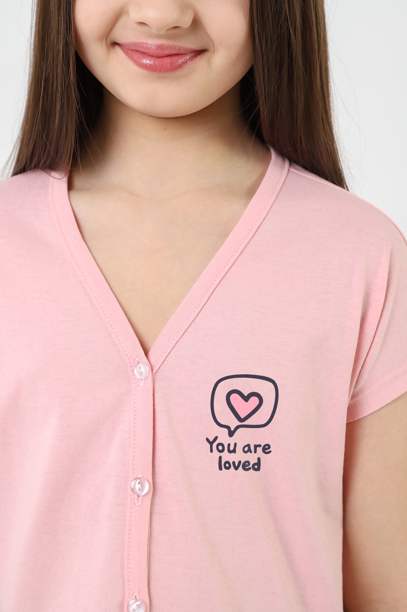 Пижама для девочки, состотящая из блузы и шорт. Блуза пижамная - из гладкокрашенного полотна "кулирка", свободжного покроя, с короткими цельнокроеными рукавами, V-образной горловиной и центральной бортовой застежкой на обметанные петли и пуговицы. В верпхней части левой полочки - принт, выполненный в технике шнлкографии. Борта и горловина окантованы основным материалом. Шорты - из полотна "кулирка" в клетку, расклешеные, короткие, с эластичной тесьмой по талии.