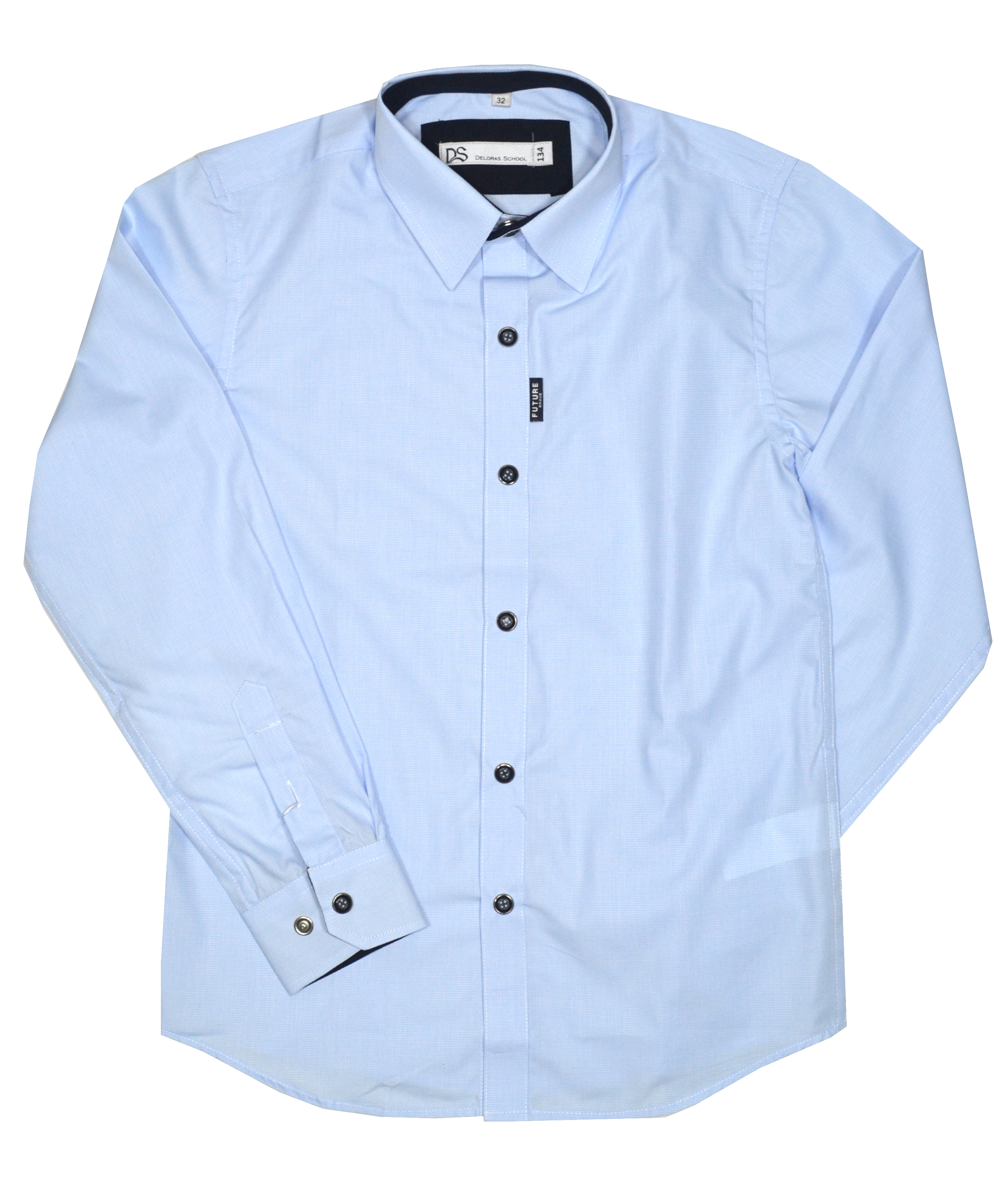 Классическая рубашка для мальчика с длинным рукавом. Застежка на кнопки, по виду похожие на пуговицы. Приталенная, по спинке вытачки. Подворотник контрастный по цвету. Материал высокого качества, гладкий и плотный, не просвечивает. Ткань в мелкую клетку со светло-голубым.