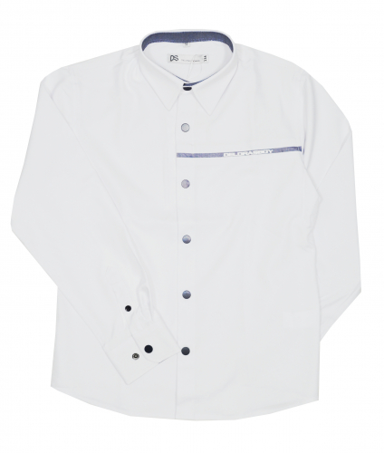 Классическая рубашка для мальчика с длинным рукавом. Застежка на кнопки. Приталенная, по спинке вытачки. Подворотник контрастный по цвету. Материал высокого качества, гладкий и плотный, не просвечивает. Ткань легко гладить, удобна в носке не мнется сильно. Вставка синего цвета с прорезиненной надписью.
