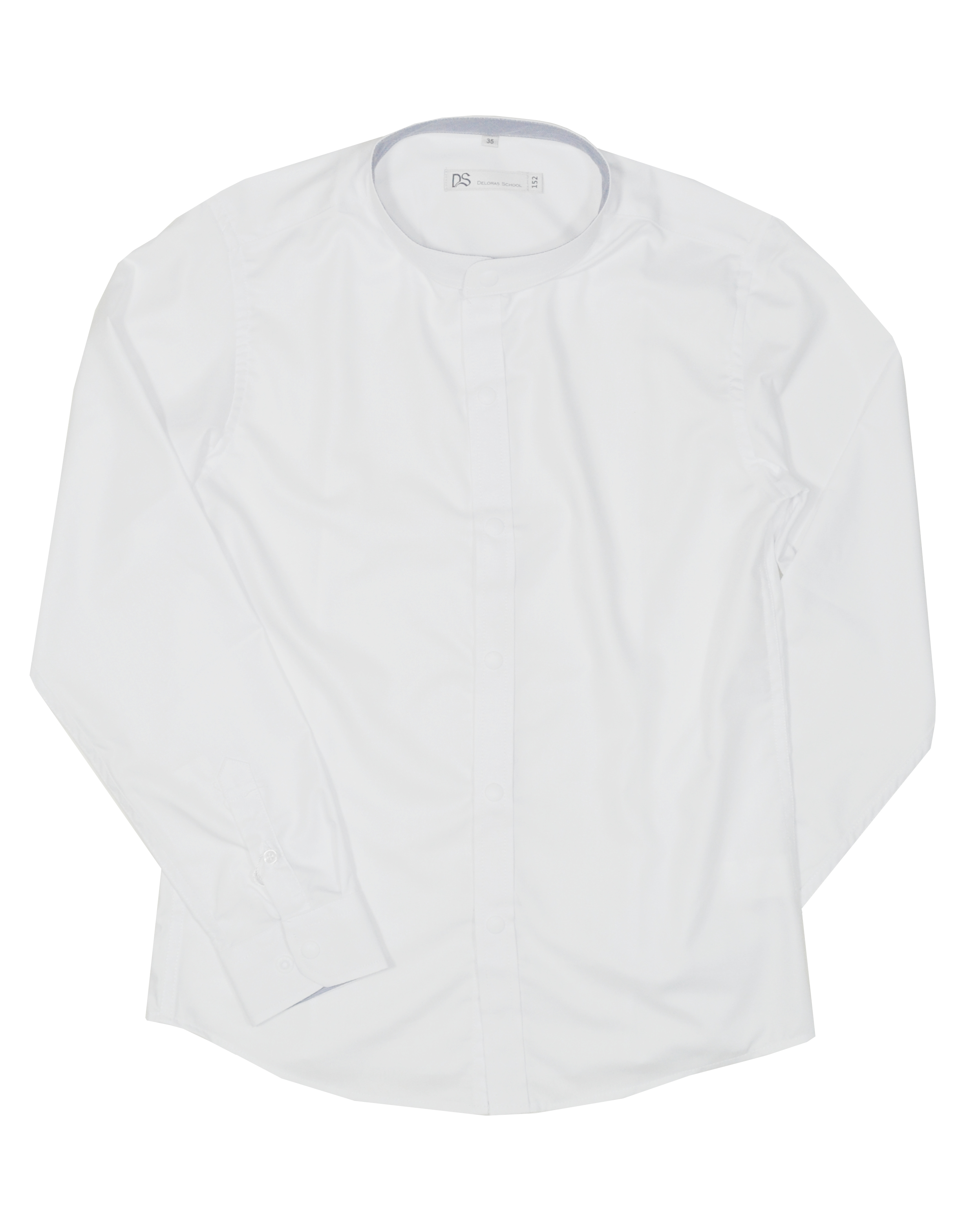 Прямого кроя рубашка для мальчика из премиальной вискозы с воротником стойкой. Застежка на кнопки белого цвета. Ткань плотная и приятная к телу, не требует утюжки. Материал высокого качества, гладкий и плотный, не просвечивает. Подворотник по горловине и манжетам синего цвета.  Отличный вариант на каждый день.