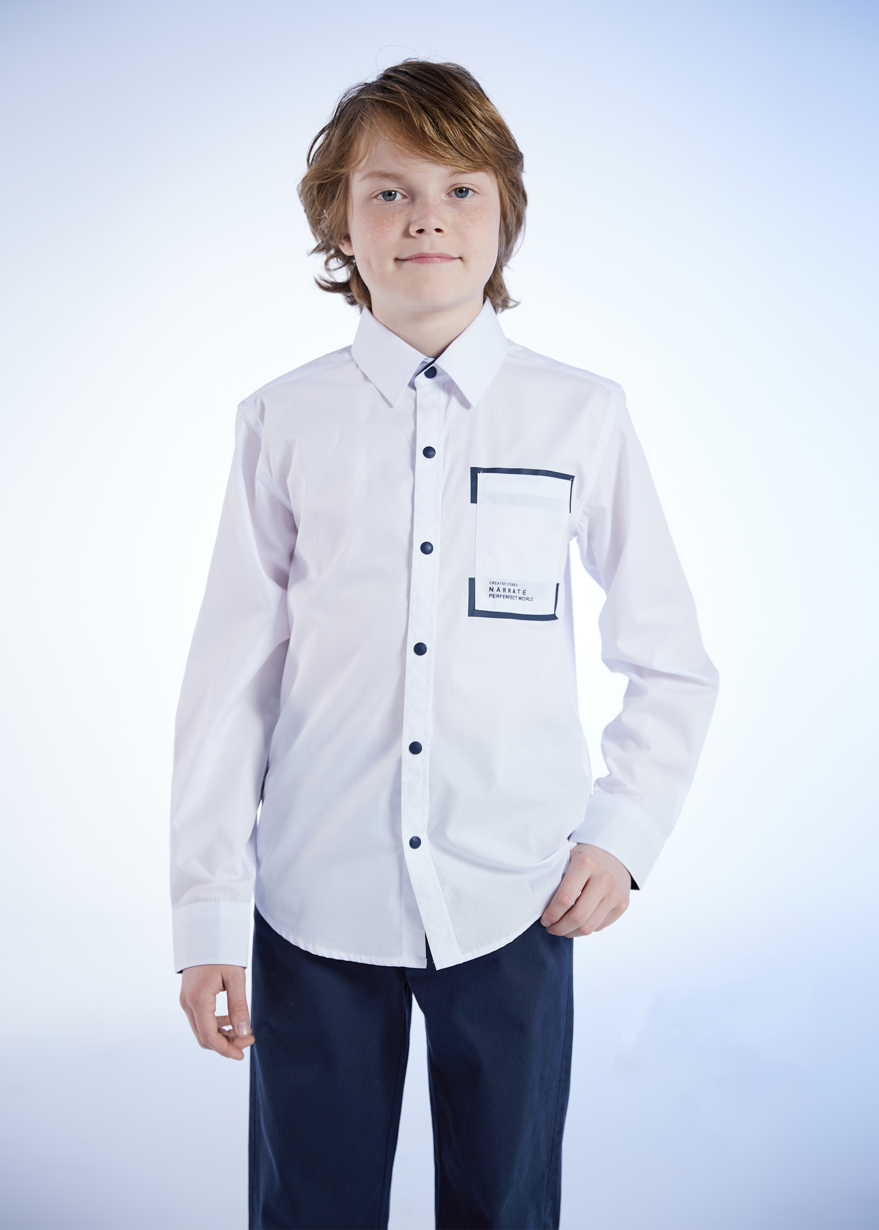 Прямого кроя рубашка для мальчика. Застежка на кнопки.   Ткань плотная и приятная к телу. Материал высокого качества, гладкий и плотный, не просвечивает.  Отличный вариант на каждый день. В районе груди нанесен принт.