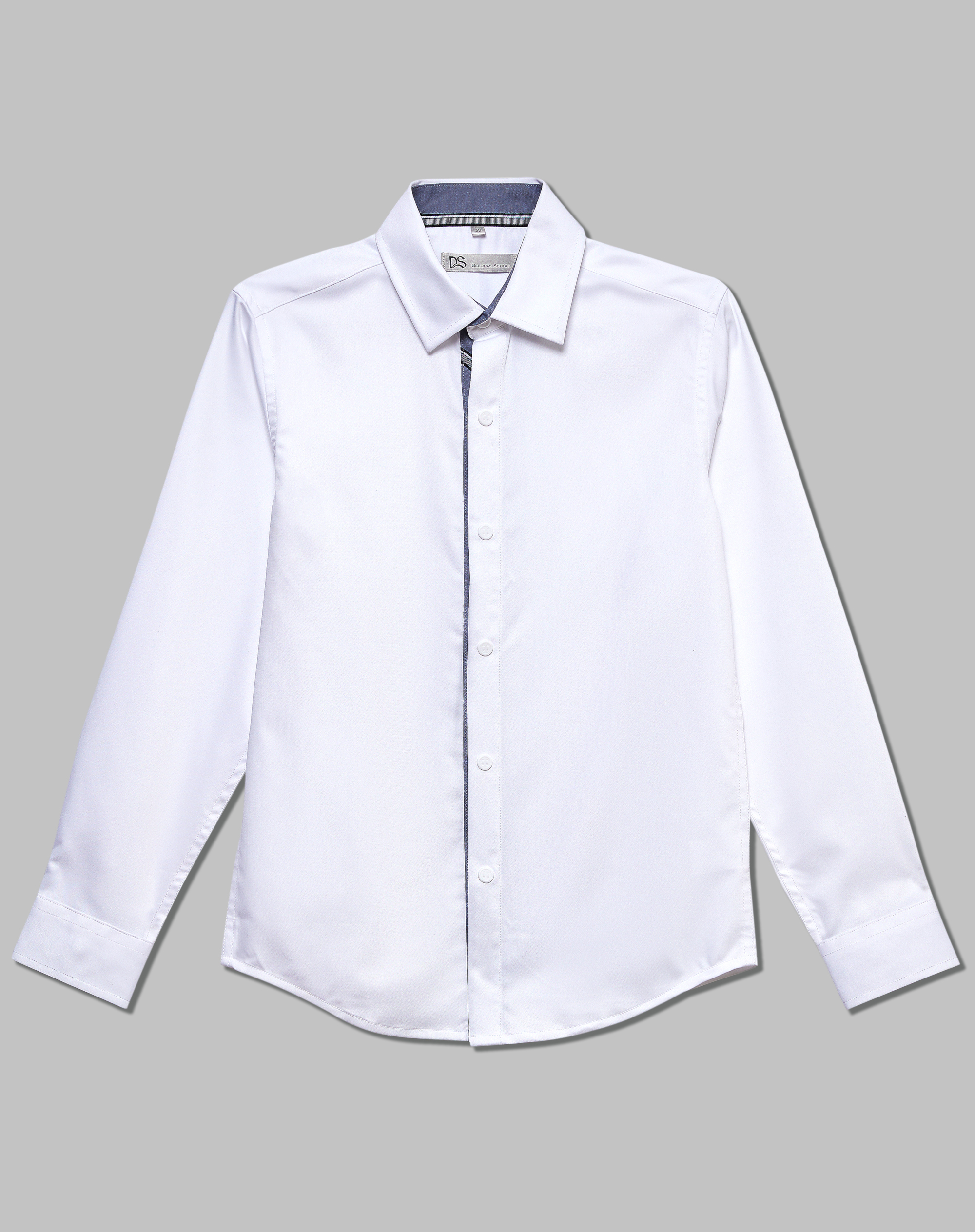 Прямого кроя рубашка для мальчика из премиальной вискозы. Застежка на кнопки белого цвета. Ткань плотная и приятная к телу, легко утюжить. Материал высокого качества, гладкий и плотный, не просвечивает. Подворотник по горловине и манжетам синего цвета.  Отличный вариант на каждый день. По спинке вытачки.