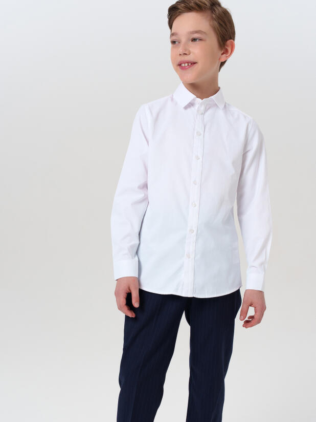 Рубашка с длинным рукавом застёгивается на классические пуговицы, а воротник держит форму даже после многократных стирок. Белый цвет делает её универсальной — её можно надеть и с жилетом, и под школьный пиджак из коллекции PlayToday, а также дополнить галстуком или бабочкой. Это не просто школьная рубашка — это база, с которой начинается любой продуманный образ.