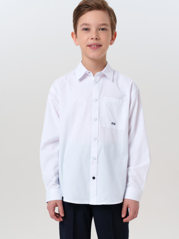 Oversize-крой придаёт образу модный акцент, а классический воротник делает рубашку нарядной и аккуратной. Нагрудный карман добавляет практичности — удобно положить карточку, записку и другую важную мелочь. Эта белая школьная рубашка — незаменимая вещь в гардеробе подростка: она легко сочетается с любой школьной одеждой и подчёркивает аккуратный, ухоженный вид.