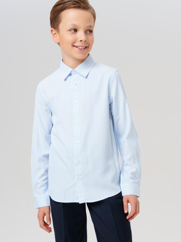 Эта школьная рубашка для мальчика-подростка с длинным рукавом — отличный вариант для 1 сентября, выпускного и повседневной школьной жизни. Нежный голубой цвет в тонкую полоску делает образ аккуратным, собранным и при этом не слишком формальным — как раз то, что нужно для подростка, который хочет выглядеть стильно, но не скучно.