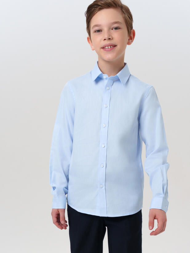 Рубашка с длинным рукавом застёгивается на классические пуговицы, а воротник держит форму даже после многократных стирок. Голубой цвет делает её универсальной — её можно надеть и с жилетом, и под школьный пиджак из коллекции PlayToday, а также дополнить галстуком или бабочкой. Это не просто школьная рубашка — это база, с которой начинается любой продуманный образ.