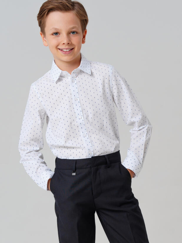 Рубашка с длинным рукавом застёгивается на классические пуговицы, а воротник держит форму даже после многократных стирок. Белый цвет делает её универсальной — её можно надеть и с жилетом, и под школьный пиджак из коллекции PlayToday, а также дополнить галстуком или бабочкой. Это не просто школьная рубашка — это база, с которой начинается любой продуманный образ.