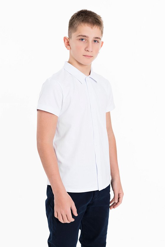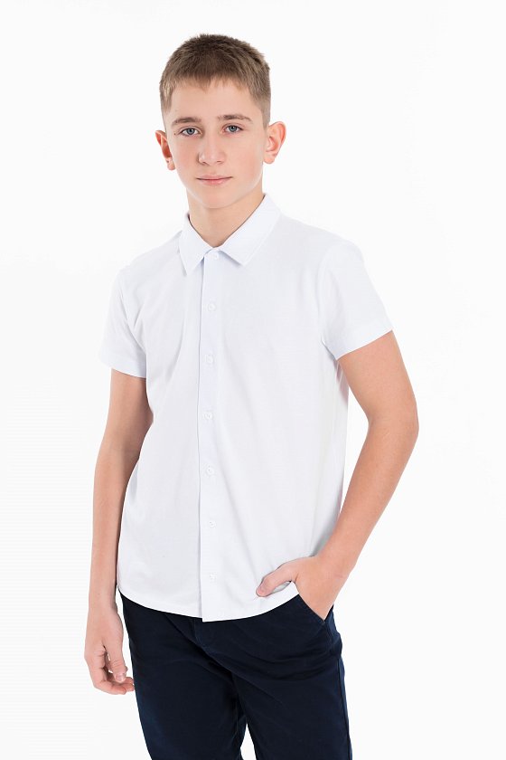 Белая рубашка с коротким рукавом из материала кулирка с лайкрой и застёжкой на пуговицы — отличный выбор для школьника. Обеспечивает свободу движений, комфорт и аккуратный внешний вид. Воротник придаёт изделию стильный вид.