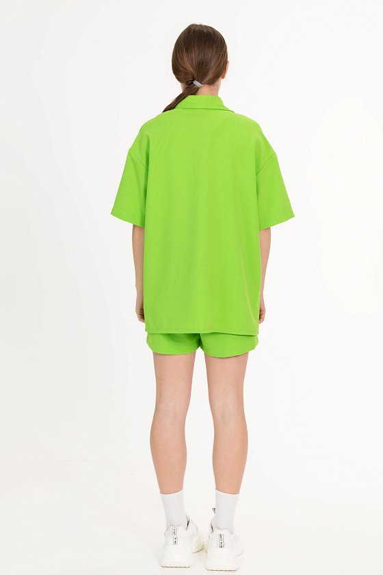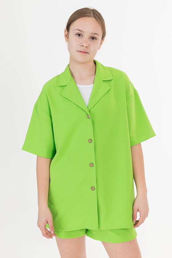 Рубашка — стильный и практичный элемент гардероба. Она изготовлена из практичного однотонного полотна, имитирующего лён. Рубашка имеет короткий рукав, застёгивается на пуговицы и дополнена отложным воротником.