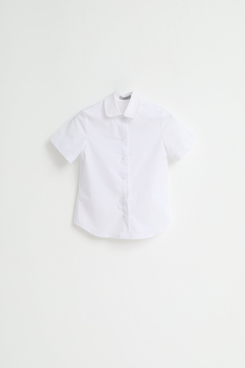 Модель приталенного силуэта из сорочечная ткани стрейч. Отложной воротничок со стойкой и скругленными уголками, застежка на кнопки, отрезная кокетка на спинке, короткие рукава и фигурная линия низа