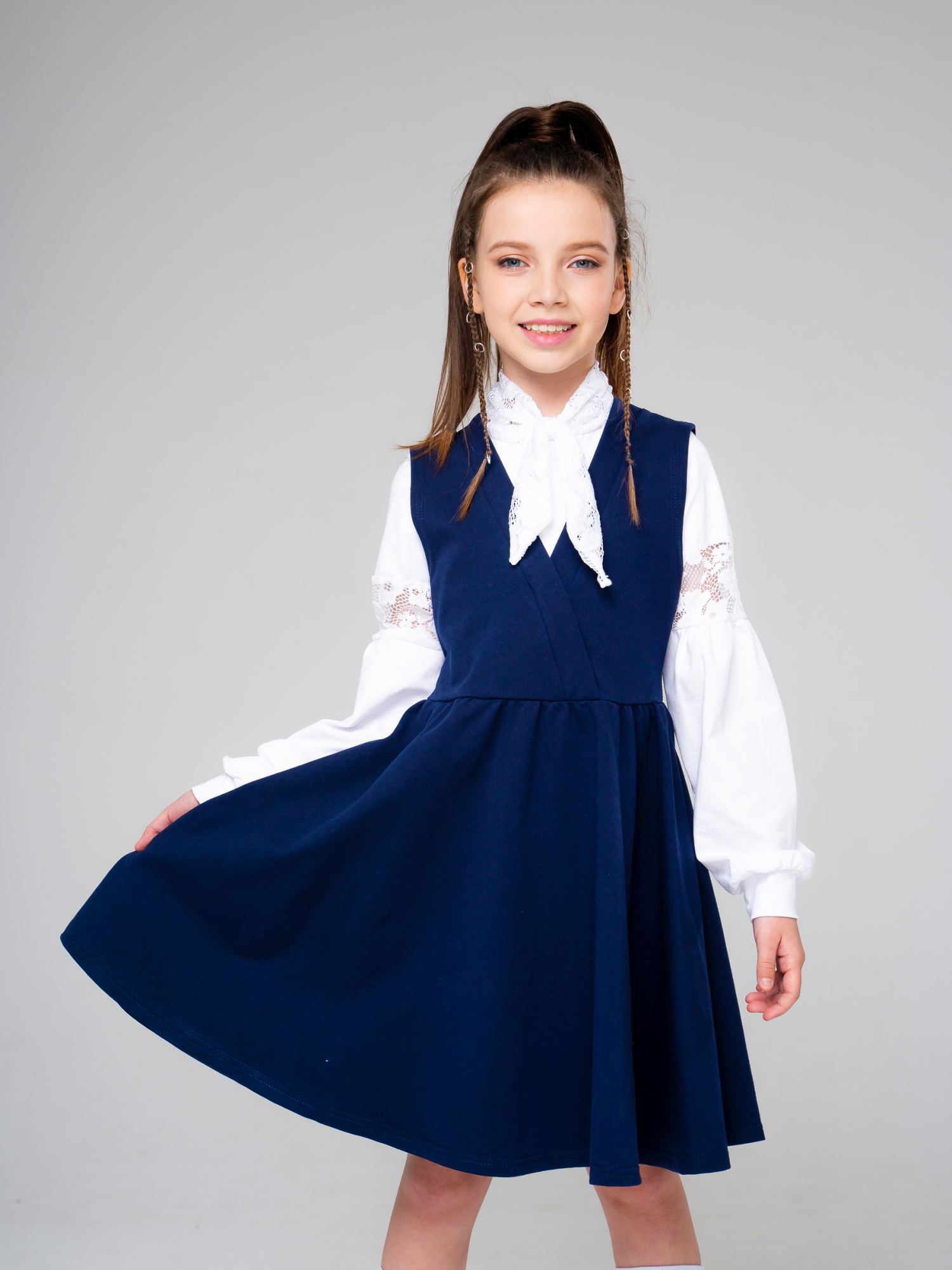 Стильный школьный сарафан из футера синего(индиго) цвета для девочки, отрезной по линии талии. Юбка расклешенная, со сборками, лиф с имитацией запаха. Изделие выполнено из трикотажа премиального качества - ПЕНЬЕ, с содержанием хлопка более 92%