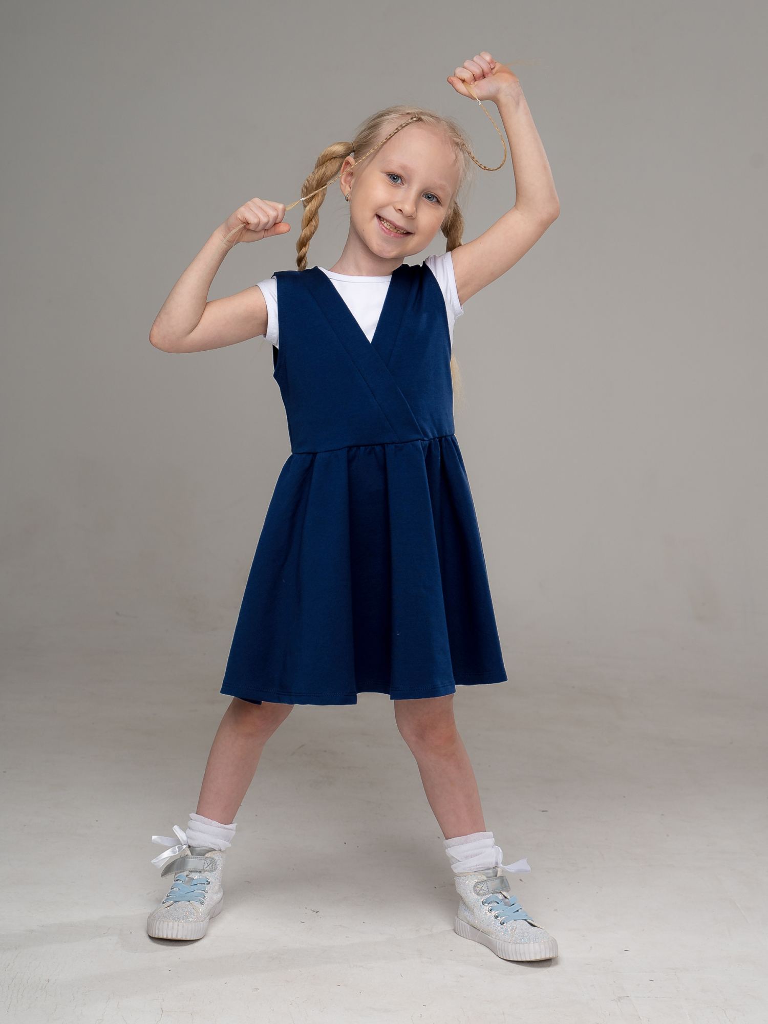 Стильный школьный сарафан из футера синего(индиго) цвета для девочки, отрезной по линии талии. Юбка расклешенная, со сборками, лиф с имитацией запаха. Изделие выполнено из трикотажа премиального качества - ПЕНЬЕ, с содержанием хлопка более 92%