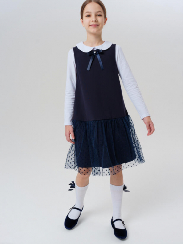 Классический тёмно-синий школьный сарафан non iron А-силуэта для девочки подростка от PlayToday — удобный и эффектный элемент гардероба школьницы. Лёгкий трикотаж и воздушная сетчатая оборка создают образ, который сочетает в себе строгость и игривую нотку.