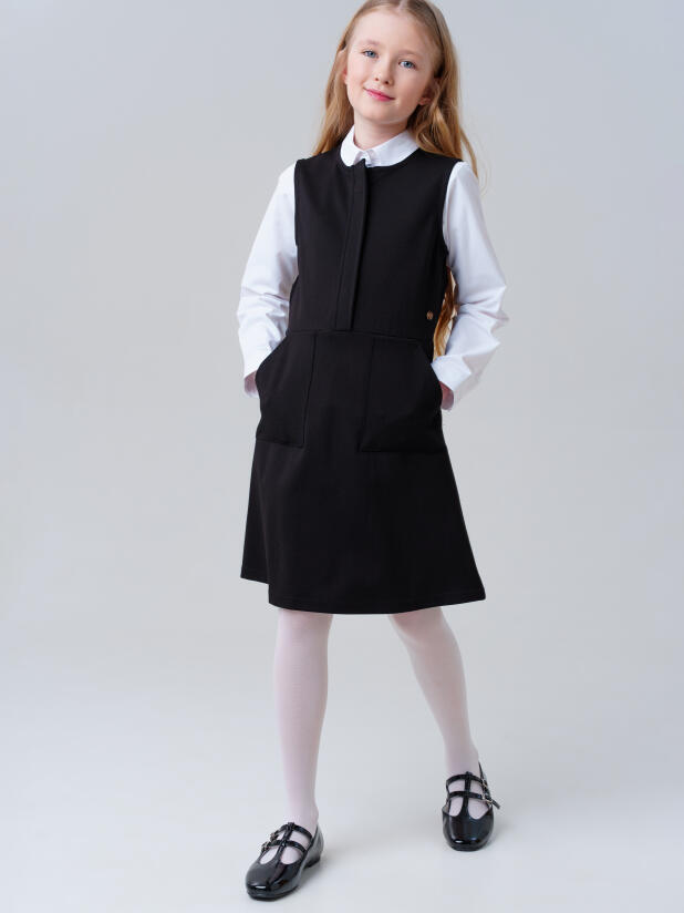 Классическое чёрное школьное трикотажное платье сарафан для девочки подростка от PlayToday — стильная и удобная модель для ежедневной учёбы и торжественных мероприятий. Универсальный детский сарафан идеально вписывается в строгий школьный дресс-код, обеспечивая максимальный комфорт и свободу движений в течение всего дня.
