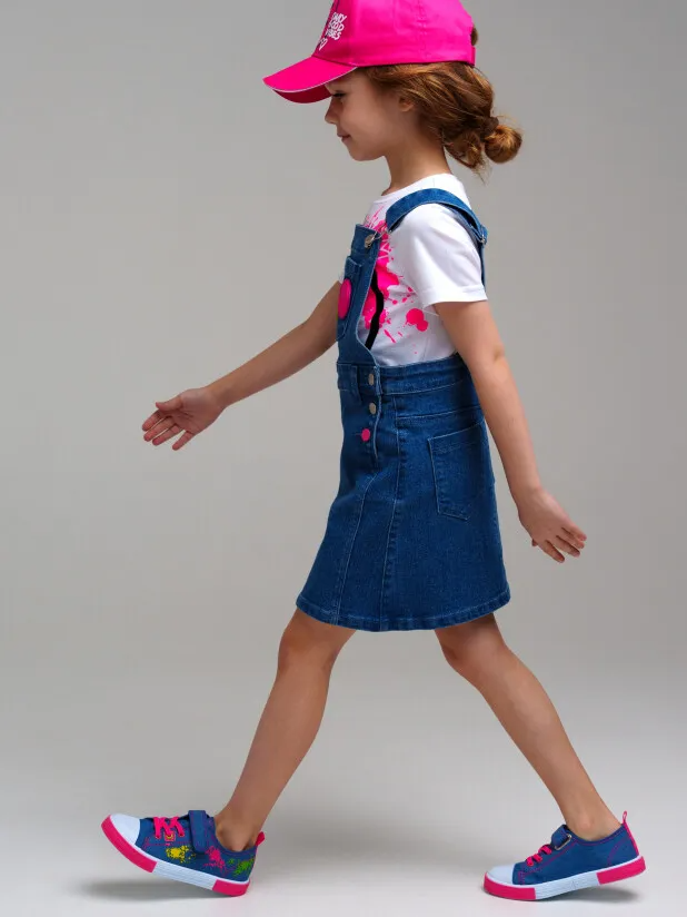 Сарафан джинсовый для девочки. Пояс на резинке с утяжкой, застежка на пуговицы.
