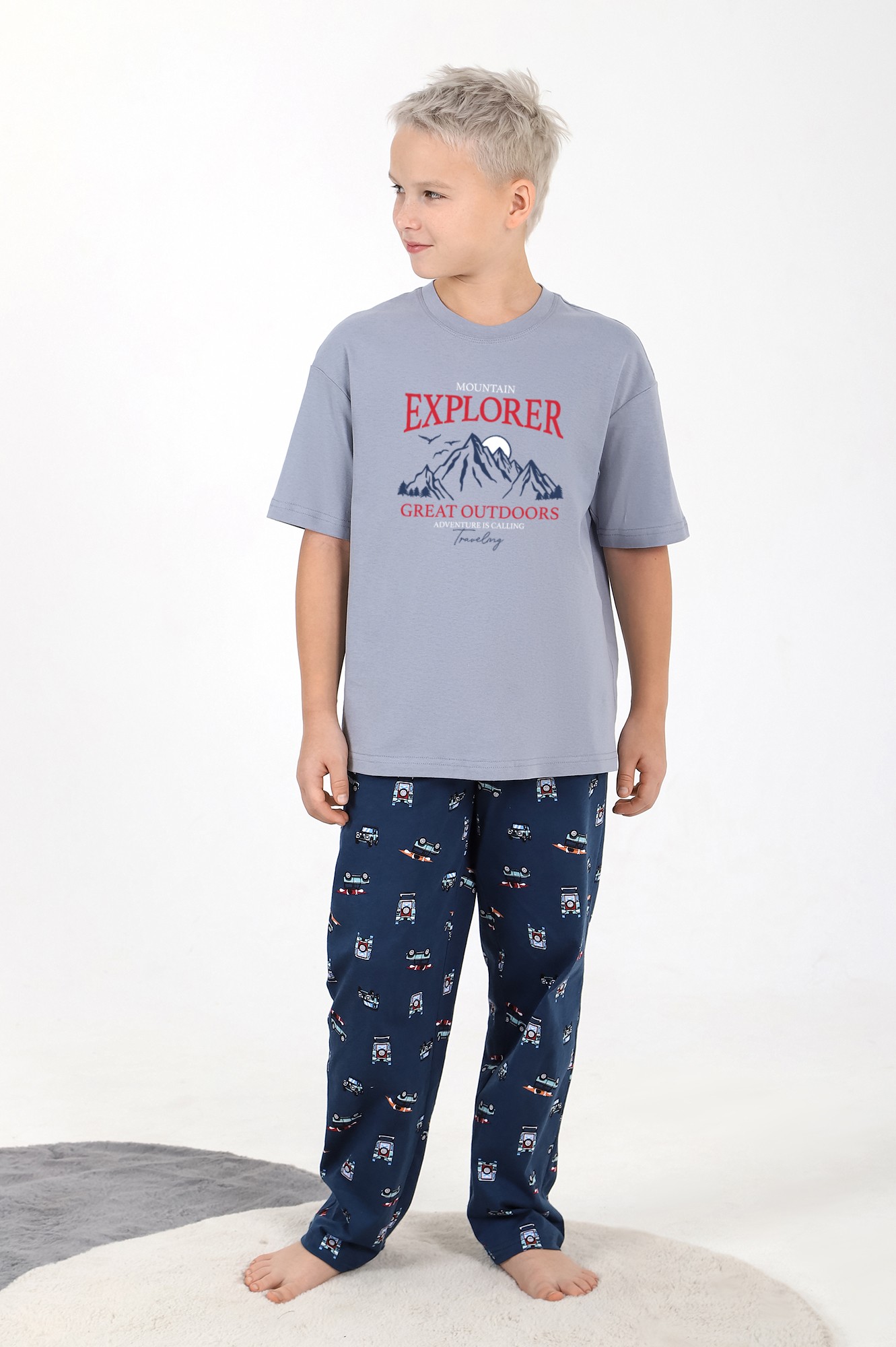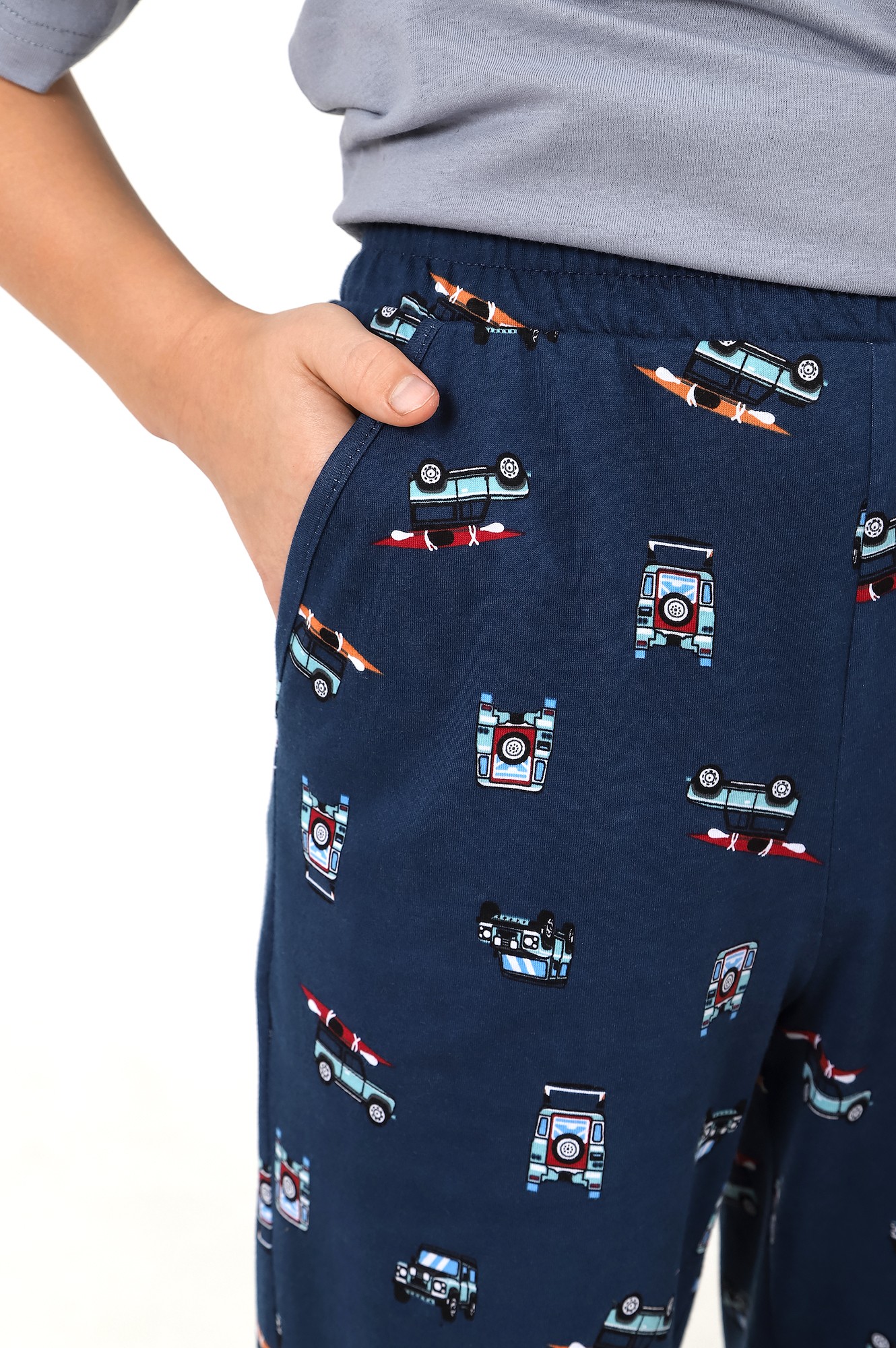 Костюм для мальчика ,состоящий из футболки и брюк. Футболка - из гладкокрашеного полотна "кулирка", классического покроя, с короткими втачными рукавами, горловиной овальной формы, обработанной втачной планкой, и принтом вцентре переда, выполненным в технике шелкографии. Брюки - из полотна с набивным рисунком, прямого силуэта, на притачном поясе с эластичнойтесьмой внутри и карманами в боковых швах, входы в которые окантованы основным материалом.