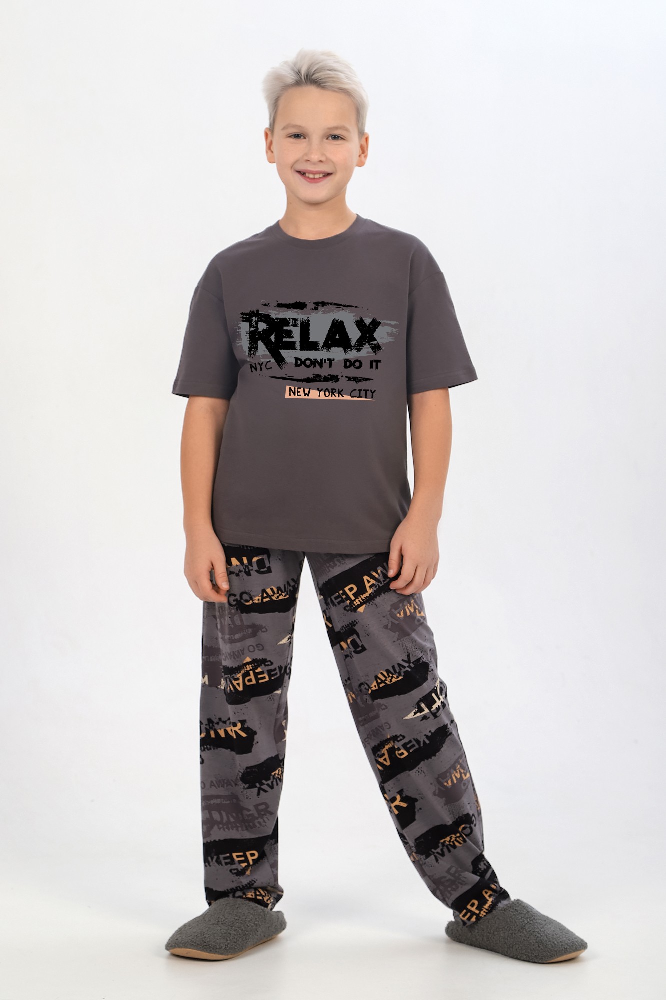 Костюм для мальчика ,состоящий из футболки и брюк. Футболка - из гладкокрашеного полотна "кулирка", классического покроя, с короткими втачными рукавами, горловиной овальной формы, обработанной втачной планкой, и принтом вцентре переда, выполненным в технике шелкографии. Брюки - из полотна с набивным рисунком, прямого силуэта, на притачном поясе с эластичнойтесьмой внутри и карманами в боковых швах, входы в которые окантованы основным материалом.