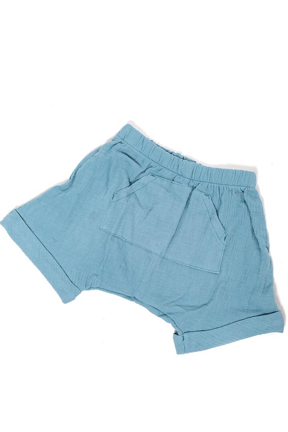 Шорты выполнены из муслиновой ткани. Покрой свободный, под памперс.
