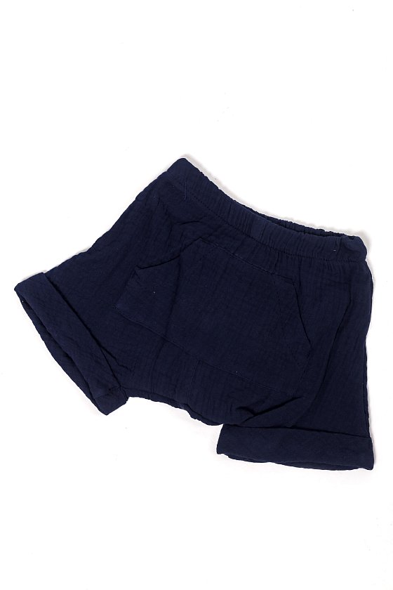 Шорты выполнены из муслиновой ткани. Покрой свободный, под памперс.