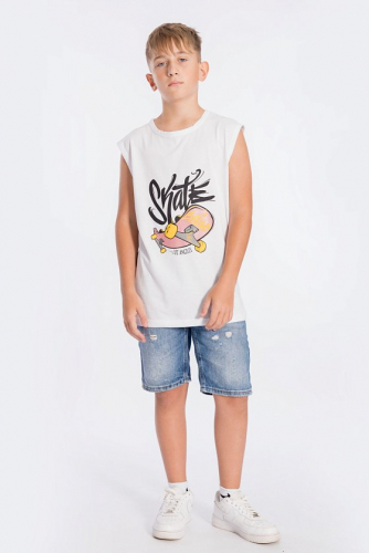Шорты для мальчика, с принтом и карманами по бокам. Низ оформлен отворотами, пояс на резине. Выполнены из хлопкового полотна.