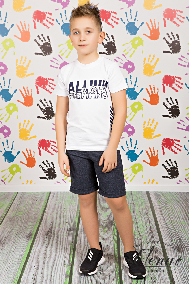 Детские шорты выполнены из футер петли с лайкрой. В поясе вставлена эластичная резина и широкий шнур. Низ шорт оформлен отворотами. Спереди два кармана. Спереди, на правой  стороне шорт размещен принт. Хлопок 95% Лайкра 5%