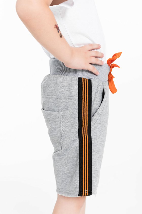 Шорты для мальчика из футер петли. В шортах есть карманы по бокам, а также сзади расположены два накладных кармана. Пояс из кашкорсе с люверсами и ярким отделочным шнуром. Вдоль бокового шва настрочены яркие полосы из декоративной резины. Низ шорт не обработан.